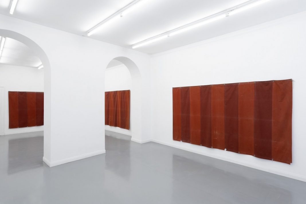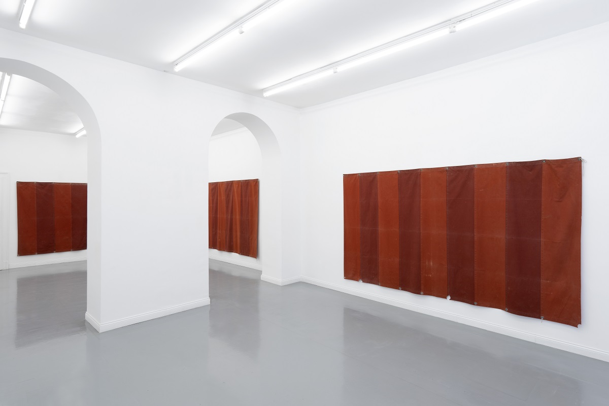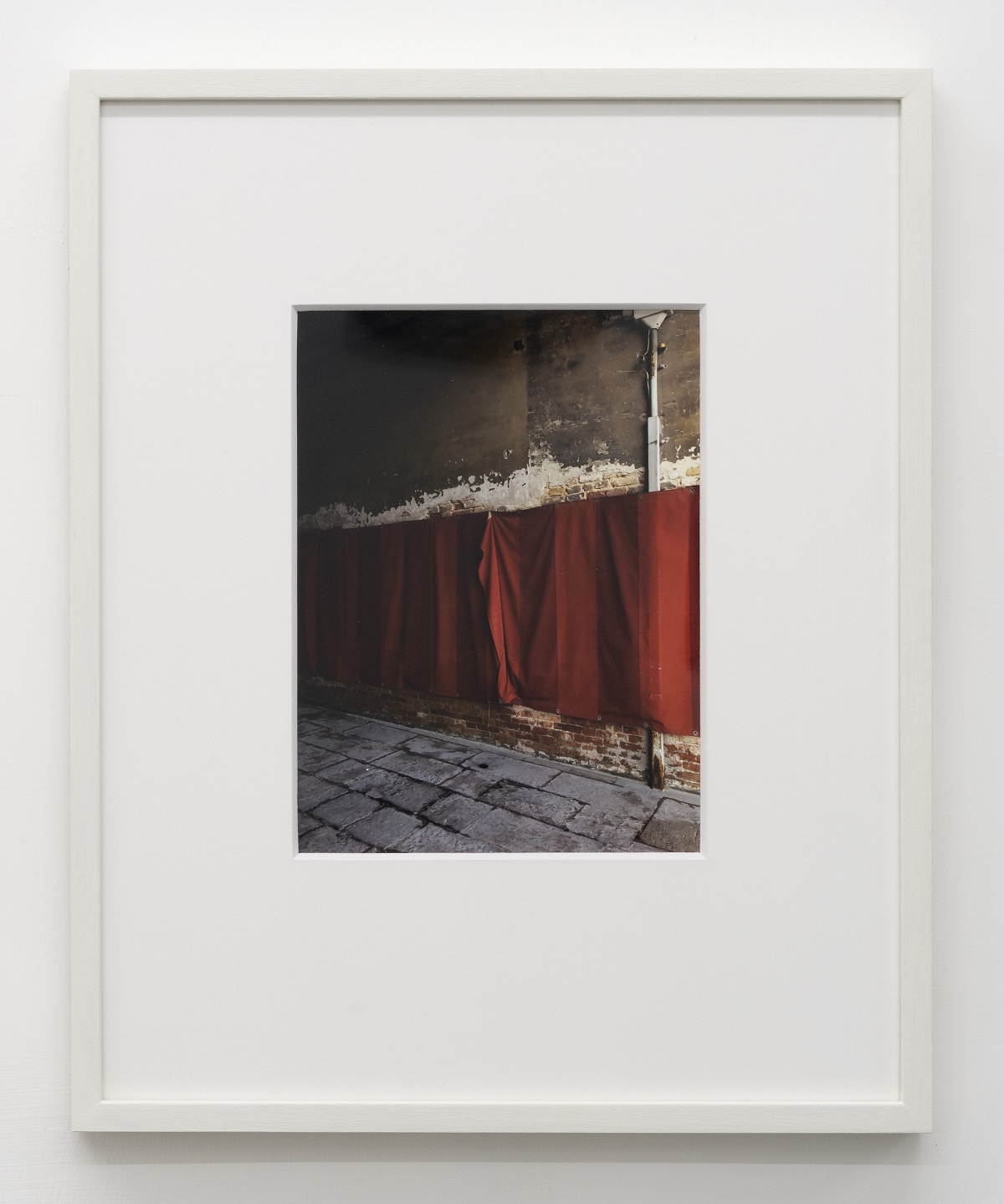 A tale riferimento, infatti, si sostanzia l’utilizzo dei teloni a bande rosse che l’artista, impossessatone a Venezia, li esibisce in quella personale prospettiva derivante dall’elaborazione personale dell’opera di Daniel Buren. L’oggetto nella sua evoluzione soggettiva viene strappato al suo uso comune, di copertura delle croste di umido su di un muro in una calle, perché suscita il riferimento sensoriale di una conoscenza diretta e formante che l’altro, in questo caso l’artista, ha percepito in ciò che diversi altri osservano solo come telone coprente.
