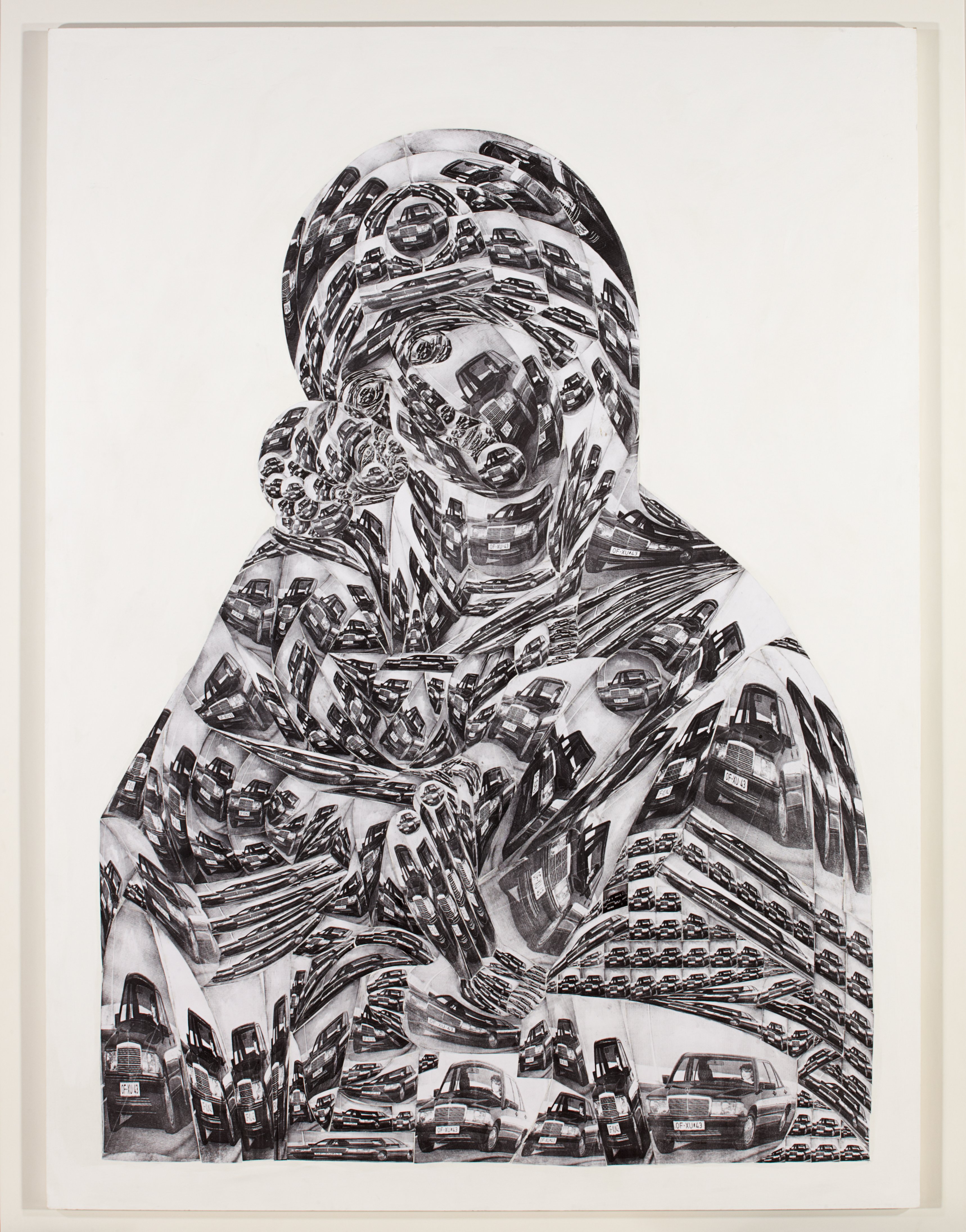 Il lavoro di Bayrle ritorna spesso sul tema dell’iconografia religiosa, reinterpretandone i soggetti classici in una chiave contemporanea, alla luce di cambiamenti economici e speciali. Una delle stanze più interessanti è proprio quella di Modern Icons, dove ci accoglie una Madonna con Bambino composta da immagini di automobili Mercedes ripetute e distorte che evidenzia quella connessione profonda tra spiritualità e seduzione, icona e status symbol, fede e consumismo. I battistrada di tre pneumatici sono appesi alla parete, incisi con tante piccole croci, raccontandoci la presenta di una sacralità anche nelle tracce lasciate dal progresso e dal movimento dell’uomo.