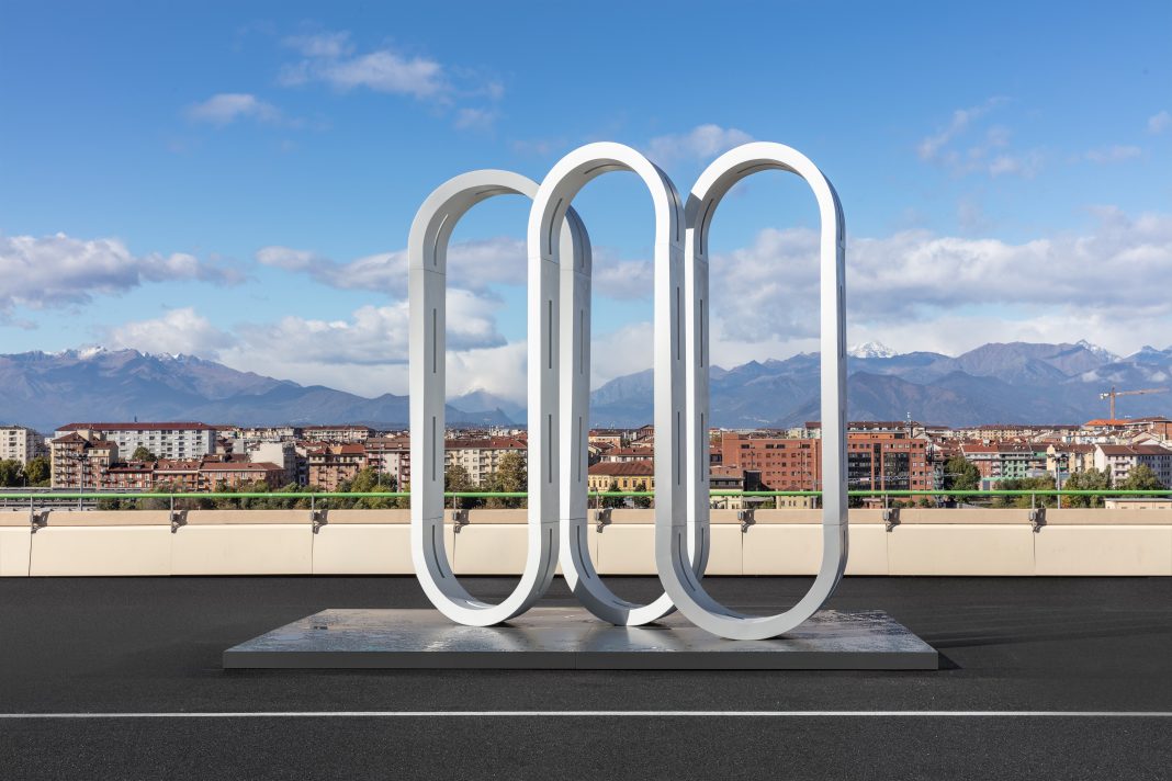 Un dialogo, quello che nasce tra le opere che esce dagli spazi del terzo piano della Pinacoteca e arriva sull’iconica pista 500. La grande scultura che svetta in cima al monumentale edificio si intitola Flamingo (2023) ed è un grande modulo stradale che richiama i circuiti dei nastri trasportatori che si intrecciano così visivamente alla catena alpina sullo sfondo.