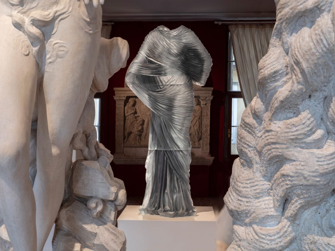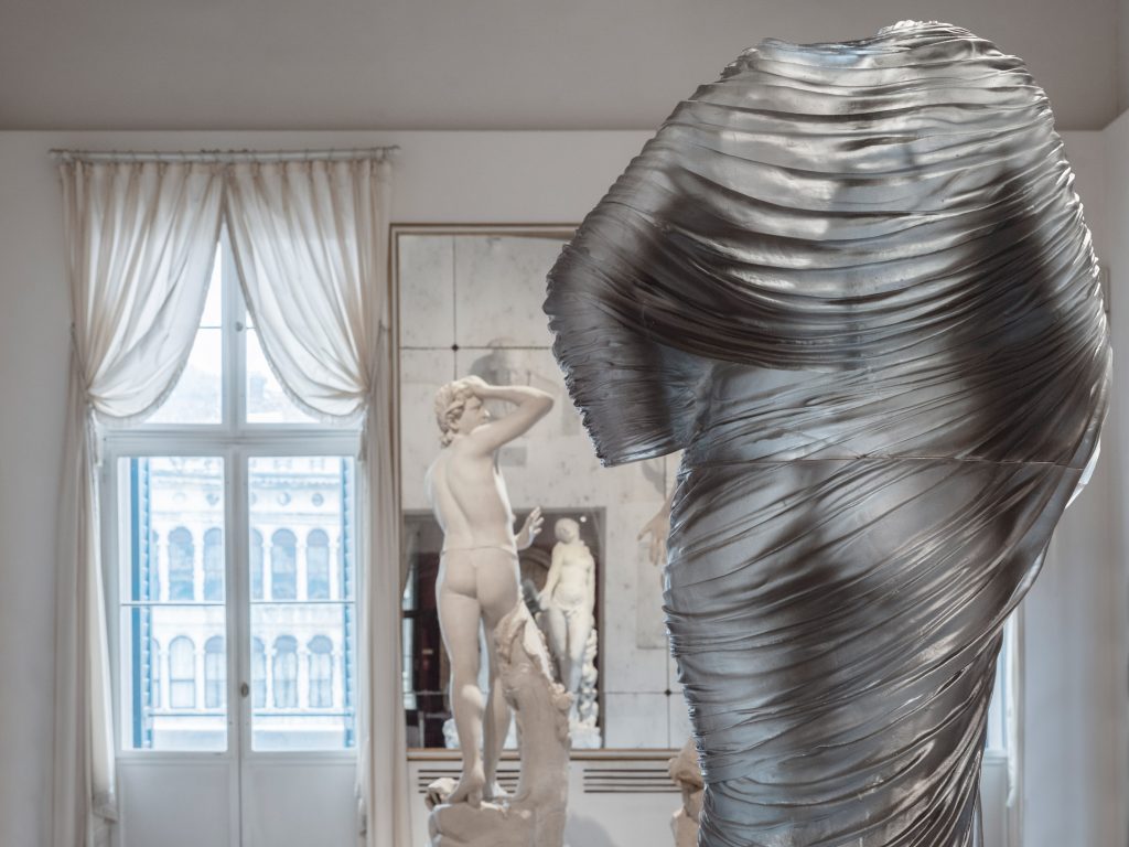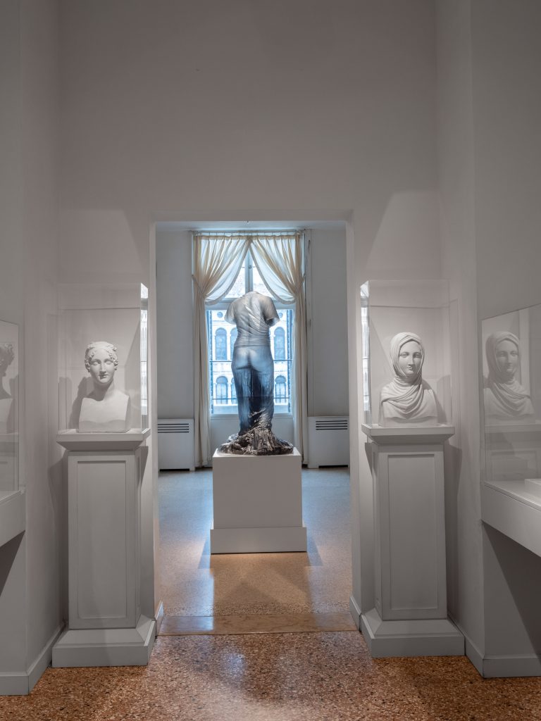 In semitrasparenza, i corpi femminili accennati nelle sculture di Karen LaMonte modellano eleganti vestiti e drappeggi. Sono abiti da sera – notturni appunto, come il titolo della mostra – che si dispiegano in sinuose pieghe all’interno delle sale canoviane del Museo Correr, dando vita a un dialogo diretto tra Neoclassicismo e contemporaneo. Curata da Chiara Squarcina ed Eraldo Mauro, la mostra Nocturnes accoglie quattro sculture realizzate in vetro, dalle tonalità profonde del blu e del grigio, colori che evocano la quiete e il mistero del crepuscolo. Le opere dialogano con alcuni dei gruppi scultorei più celebri di Antonio Canova, come Orfeo ed Euridice e Dedalo e Icaro, e con le fotografie di Fabrizio Zonta, instaurando un confronto tra epoche e linguaggi diversi.