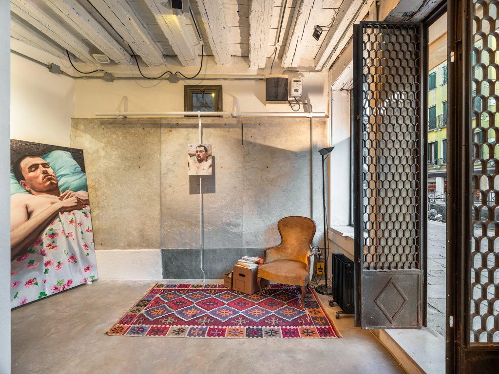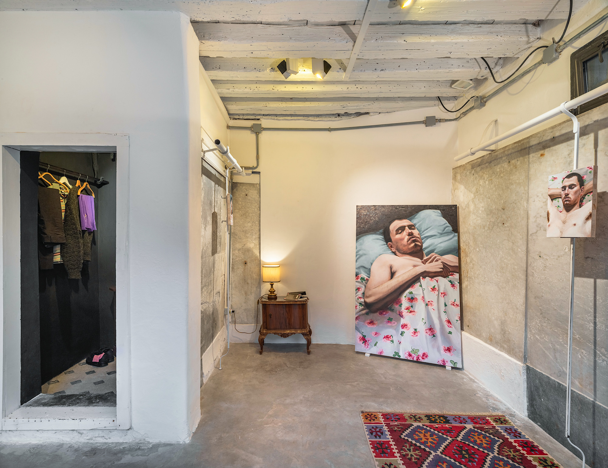 La galleria si trasforma in quest’occasione in un interno domestico che è insieme terreno e soglia. Tappeti, poltrone, lampade e cassetti diventano protagonisti di una narrazione in cui il corpo è sospeso, costretto a misurare la propria presenza senza poterla dominare. Le figure maschili dei dipinti attraversano lo spazio, lo piegano, vi si adagiano, sprofondano, si confondono con le texture ricche dei tessuti e dei pavimenti. La morbidezza della pelle contrasta con la matericità invadente degli oggetti, generando un conflitto costante tra accoglienza e resistenza. La luce, sempre dosata, dissolve i contorni trasformando il corpo nell’eco dello spazio che lo contiene.