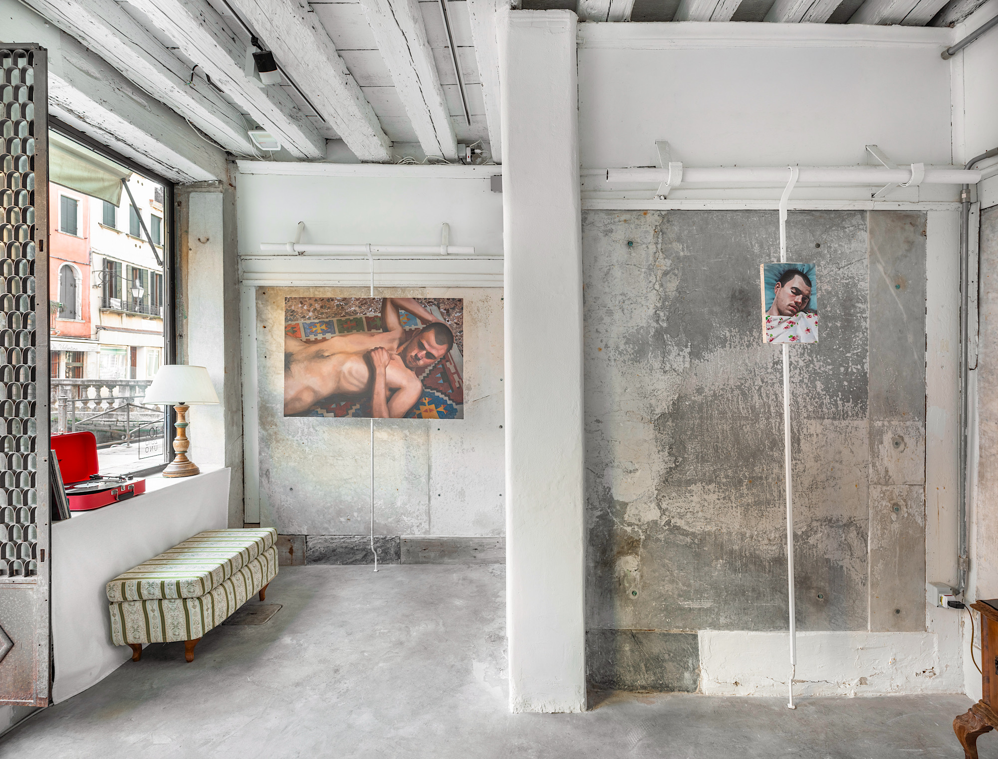 La galleria si trasforma in quest’occasione in un interno domestico che è insieme terreno e soglia. Tappeti, poltrone, lampade e cassetti diventano protagonisti di una narrazione in cui il corpo è sospeso, costretto a misurare la propria presenza senza poterla dominare. Le figure maschili dei dipinti attraversano lo spazio, lo piegano, vi si adagiano, sprofondano, si confondono con le texture ricche dei tessuti e dei pavimenti. La morbidezza della pelle contrasta con la matericità invadente degli oggetti, generando un conflitto costante tra accoglienza e resistenza. La luce, sempre dosata, dissolve i contorni trasformando il corpo nell’eco dello spazio che lo contiene.