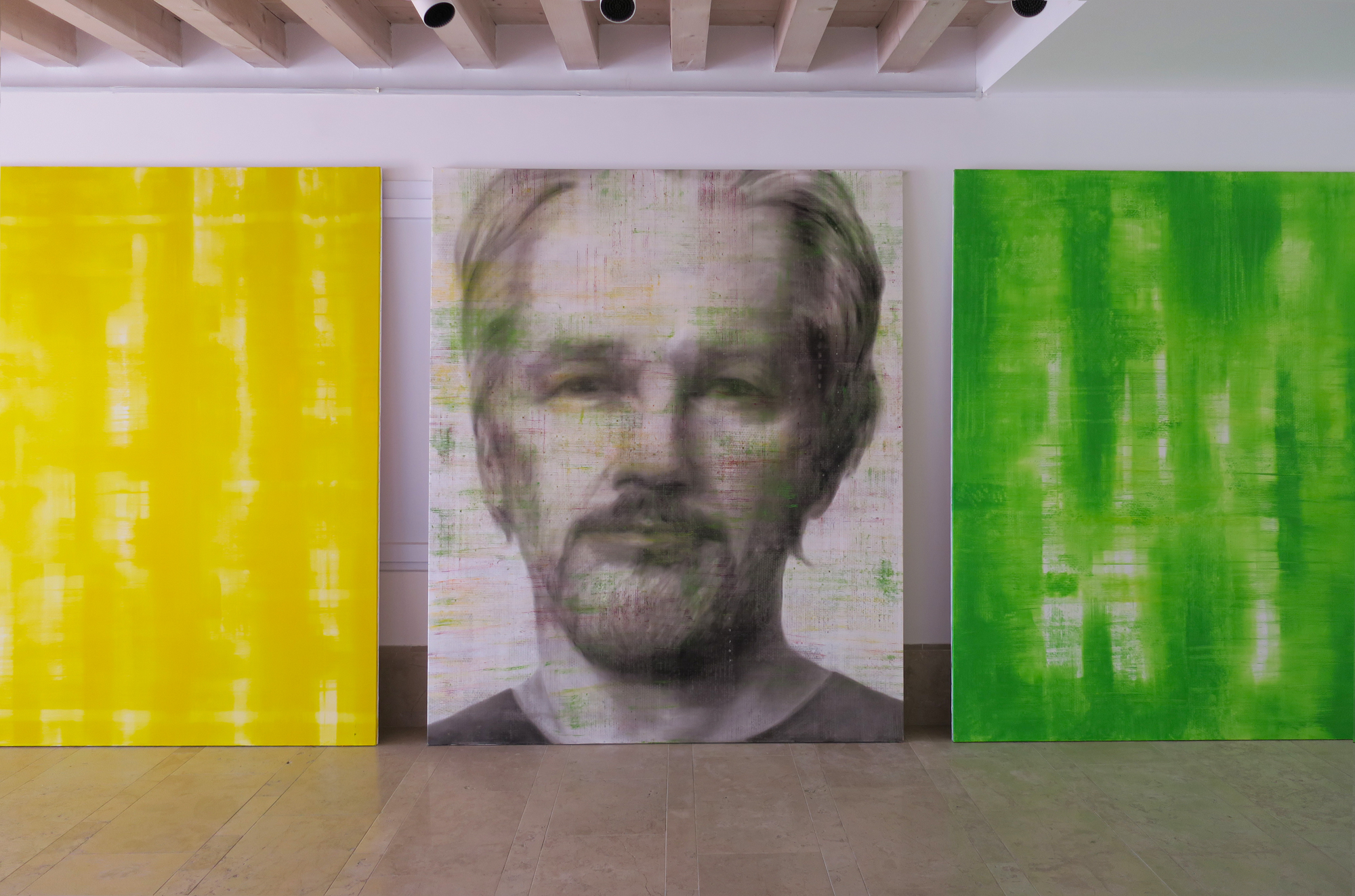 Nella sala principale l’artista dispone un ciclo pittorico composto da cinque grandi tele verticali, riservando lo spazio centrale al ritratto di Julian Assange. Le tele presentano colori puri dal forte impatto cromatico. La trama ricreata dalla sottrazione della materia pittorica sul proprio supporto crea linee e movimenti palpabili che ricordano la tessitura degli arazzi, ma si accostano, con un salto temporale notevole, ai codici numerici del linguaggio digitale, elemento chiave per presentare il volto di Assange al centro della composizione. La quinta tela si distingue dai monocromi mostrando il volto de-saturato di Assange che emerge dallo sfondo in modo nebuloso; l’alternanza tra grigi e bianchi permette alla figura di emergere, in un avvicendarsi di luci, ombre e tocchi di colore isolati quasi impercettibile.