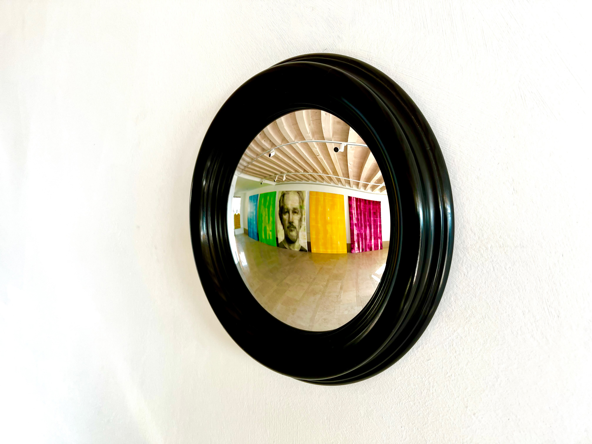 Figurazione e astrazione hanno un potere alienante sul fruitore. Nella parete frontale, a fare da spartiacque tra i due ambienti, uno specchio convesso di manifattura veneziana racchiude e deforma l’orizzonte.