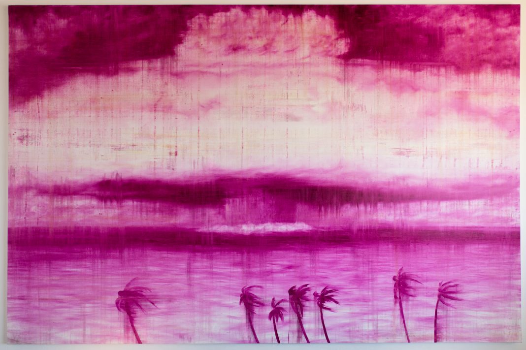La grande opera, saturata al magenta, mostra un fungo atomico che sovrasta il paesaggio circostante e le piccole palme spaurite e scomposte dal vento in primo piano. L’immagine è un fotogramma del filmato eseguito dall’esercito americano durante la prima di una serie di esplosioni atomiche sperimentali note come “Operazione Crossroads”; gli esperimenti atomici (ben 67 in 12 anni) interessarono dal 1946 le acque dell’isola Bikini, nell’atollo delle Marshall, paradiso naturalistico del Pacifico diventato poligono nucleare.