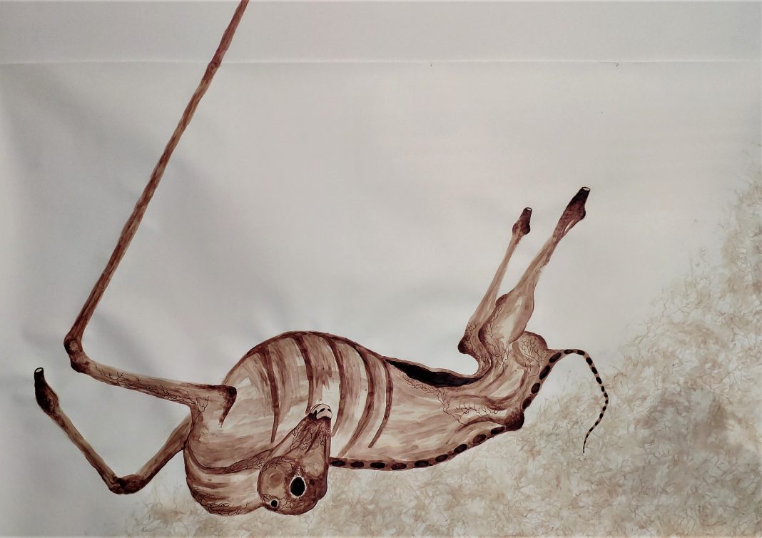 Al centro del perimetro, Vale Palmi pone cinque vasche di ferro zincato dove cadaveri d’animale hanno trasudato il loro disfacimento a comporre le geografie opalescenti di Perduranza, una decomposizione sublimata della «Vita dopo la Vita». Lo squarcio di Epifania Galvanizzata si fa poi varco tra il corpo dell’opera e dell’osservatore in una forma di concerto empatico. Agnello sensibile, comunicante, simile a una pittura rupestre dipinta con vero sangue bovino, privo della pelle ci è più prossimo. Nell’organicità del pigmento ematico, l’unico che l’artista impiega — pena il fallimento del sentire del e col segno — si presenta la verità biologica dell’opera, che tenta di penetrare nel reale mediante un arto dell’animale teso oltre il confine della tela.