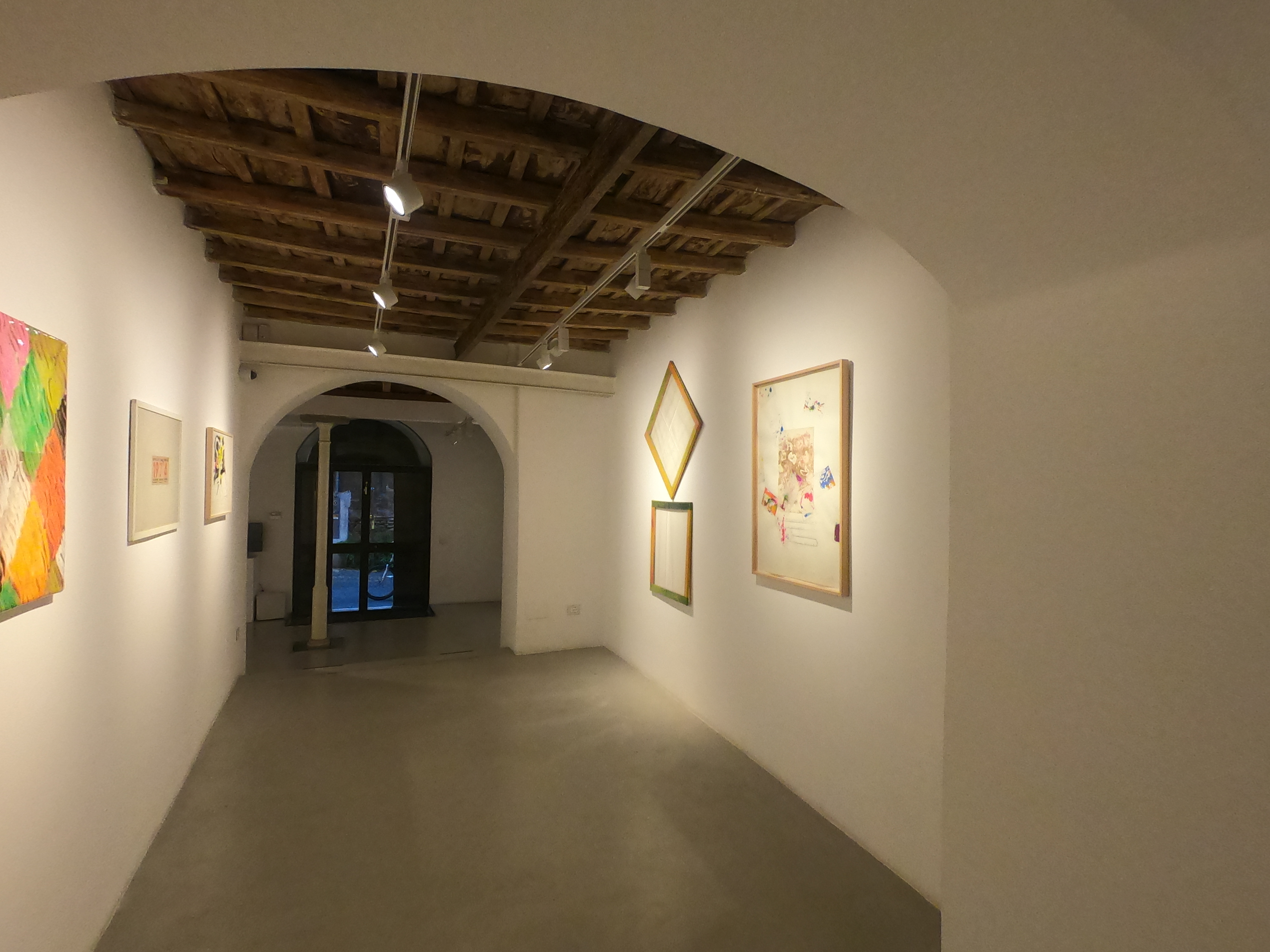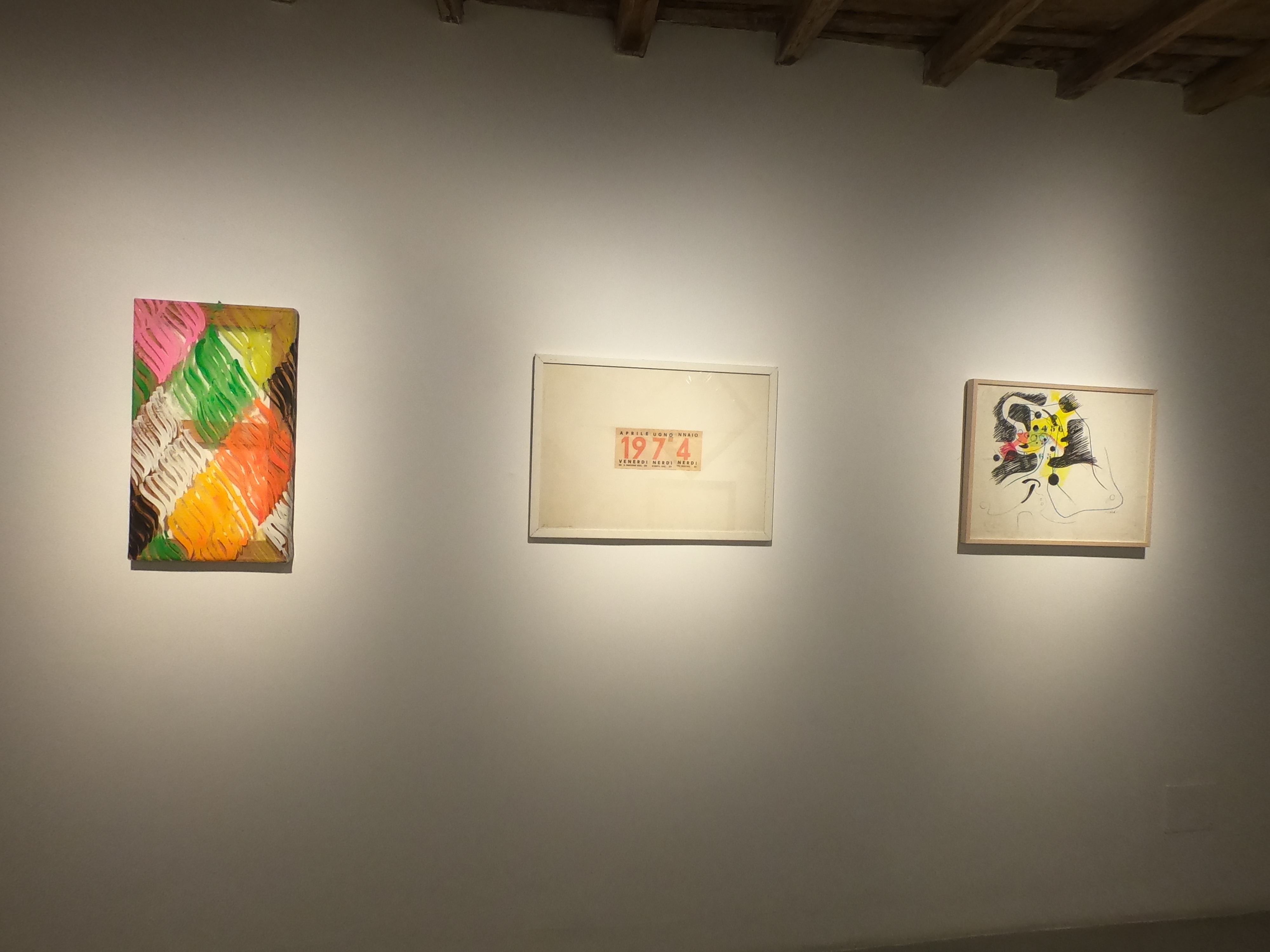 Riconosciamo, tra tutti, i segni inconfondibili di Carla Accardi. Quei segni che paiono agitarsi insofferenti del perimetro della tela, ora aggruppandosi, ora disgregandosi in una continua tribolazione, come a voler generare incessantemente nuove, imprevedibili forme. La gallerista ci fa però notare altre opere dell’artista: due Trasparenti in sicofoil (un materiale plastico semirigido) degli anni ’70 con i quali si intende esprimere la drastica – e a nostro avviso ambigua – operazione concettuale della cancellazione del segno. Eccoci di fronte a una cromatica Anatomia di Gino Marotta: un intrico di sembianti umani viene compenetrato da numeri, fonemi, figure geometriche, segni aleatori. Il richiamo a Marinetti è evidente. «La poesia visiva nasce già con il Futurismo, con le tavole parolibere…siamo tutti figli del Futurismo», ebbe a dire in un intervista Mirella Bentivoglio. E i suoi collage esposti in galleria lo confermano.