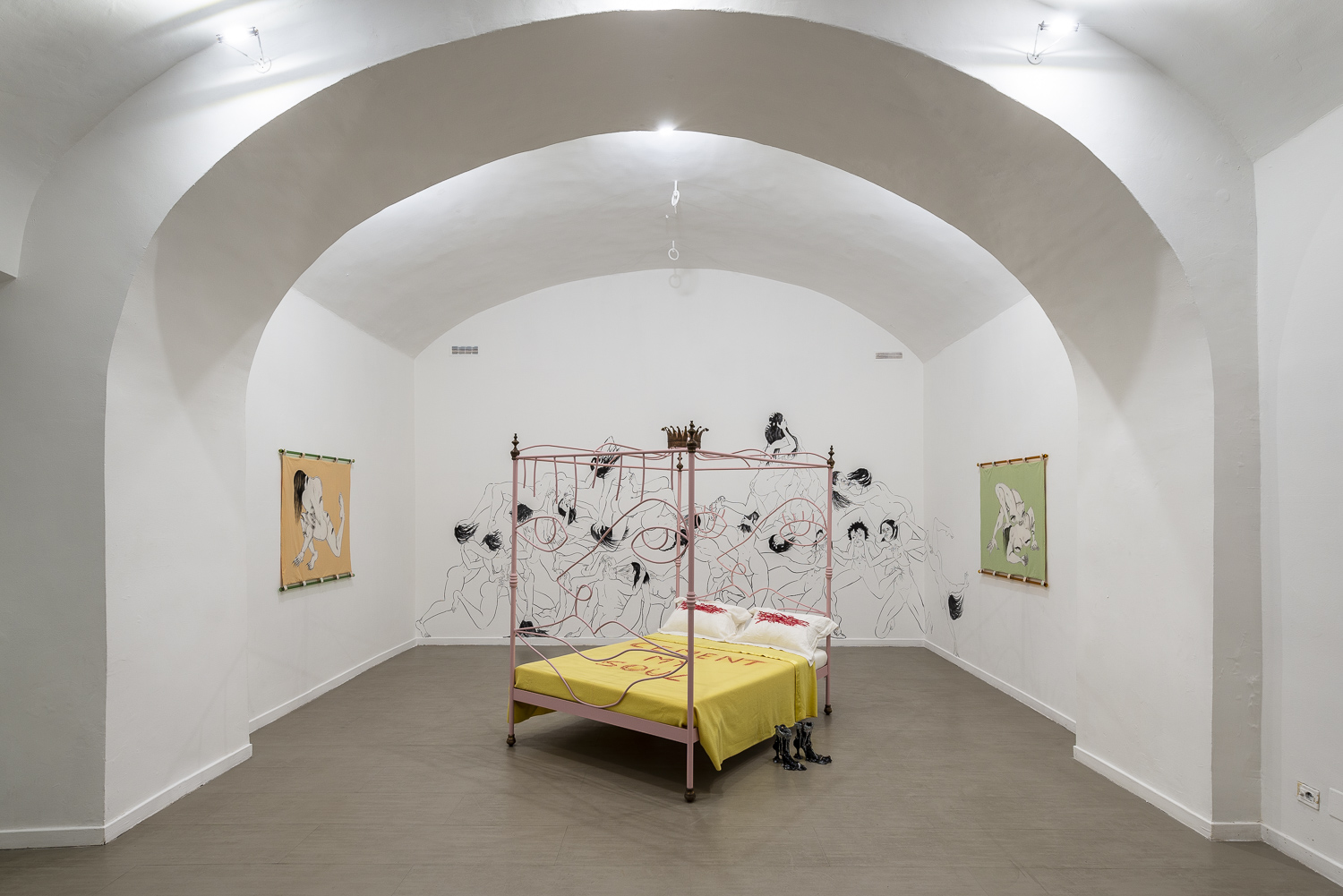Un atteggiamento premiante e trasversale che permea quasi tutte le opere, dal murales realizzato per l’occasione da Saelia Aparicio, passando per il letto a baldacchino di Charlotte Colbert su cui dovrebbe svolgersi la seconda delle due performance programmate per questa mostra, fino alle sue piccole sculture a tre file di mammelle che ricordano antichi e divini omaggi alla fertilità. Nonostante la varietà di mezzi e materiali attraverso cui si esprimono le opere in mostra è evidente come tutti i lavori dialoghino tra loro in maniera armonica e coerente.