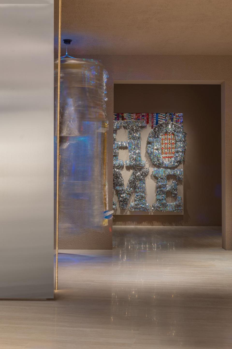 L’allestimento della mostra alla Visionnaire Wunderkammer presenta un corpus di opere di Daniel González in cui le parole diventano forma e struttura. Tra i lavori in mostra, Mapa de Encuentros (2023), un’opera di ampie dimensioni (380 x 400 cm) che materializza le connessioni umane in una trama di Mylar cucito a mano, e Personal Disco Gold & Personal Disco Silver (2024), due sculture cinetiche che uniscono luce, movimento e suono, trasformando la parola in un’esperienza multisensoriale.