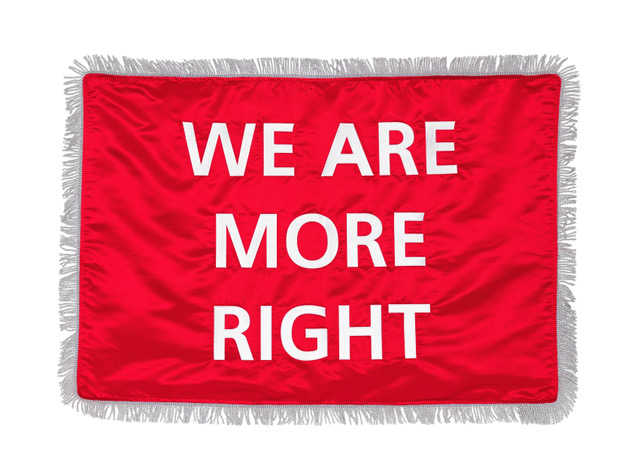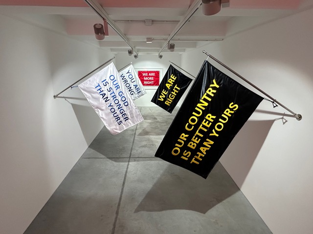 Al piano superiore della galleria troviamo Flags of No Nation, un’opera in raso che riflette sul tema della nazionalità, ponendo l’accento sulle tensioni sociali dei nostri tempi. Il lavoro analizza l’identità di un popolo partendo dalla sua bandiera e impone un’uguaglianza, sottraendone storia e simboli e sostituendoli con slogan quali: “Our God is stronger than yours”, oppure, “Our country is better than yours”. È un mimare il tono della rivalità infantile, attraverso un linguaggio famigliare e tagliente, dove il sacro lascia spazio al sarcasmo, dove la cecità dell’appartenenza cede il posto a nuovi confini ideologici.