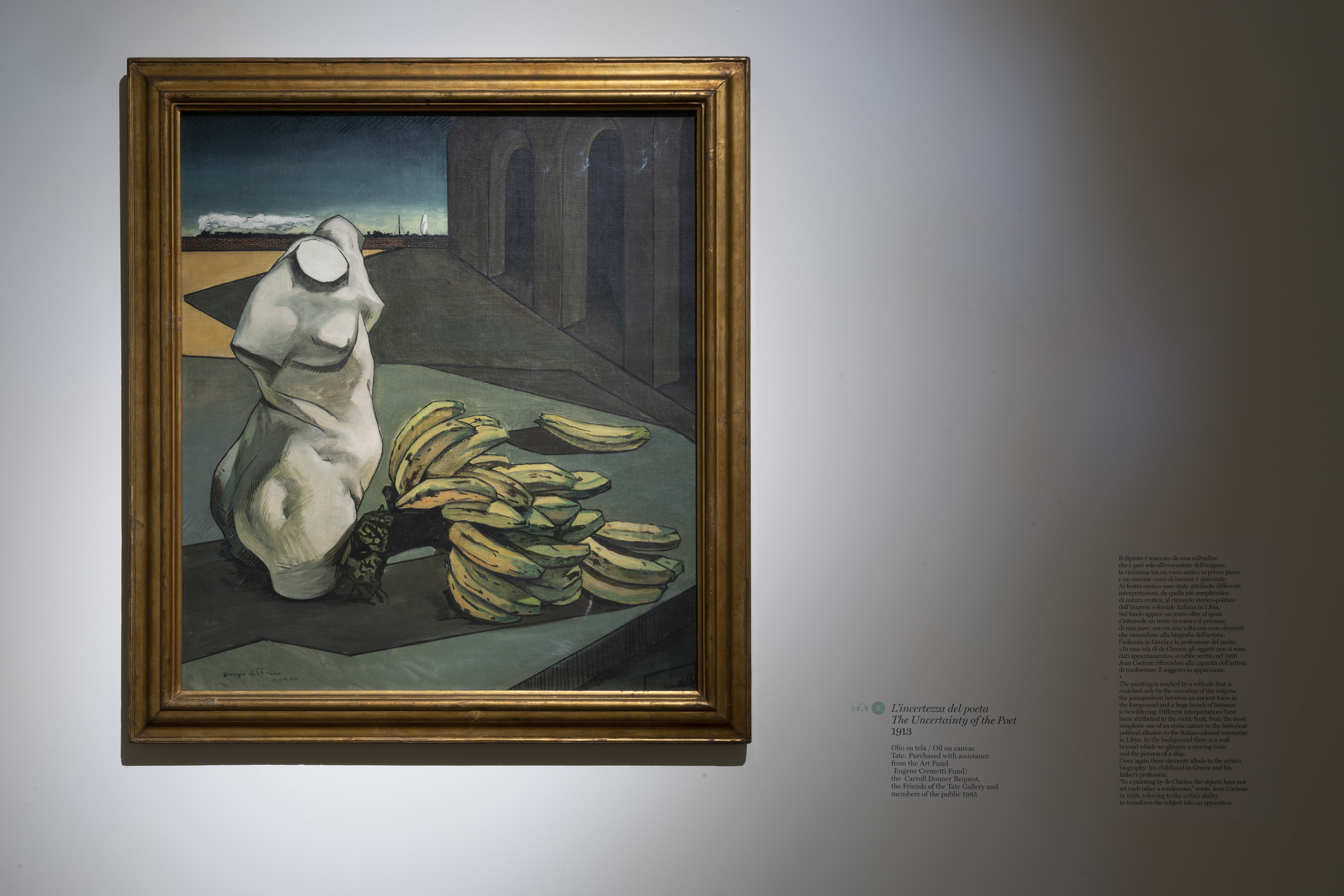 L’intellettuale De Chirico è “tutto” lì nelle sue opere, scatole della memoria, con i suoi inganni visivi e paradossi, dalle complesse problematiche filosofiche e concettuali, con la sua straniante vena immaginifica, e il suo metalinguaggio è sempre contemporaneo. Di lui Cocteau scrisse “pittore accurato prende in prestito dal sogno l’esattezza dell’inesattezza, l’uso del vero per promuovere il falso”, e come dargli torto? La mostra inscena inganni ottici, suspense visive, si confronta con le nuove generazioni, evita l’ordine cronologico per seguire un accostamento tematico, formale e compositivo, in cui i luoghi dell’erranza sono i protagonisti, e il mistero è il regista. E se, come ha scritto lapidaria, Ester Coen “Picasso smonta per riassemblare, De Chirico assembla per smontare”, passeggiando di sala in sala a Palazzo Reale tra le opere illuminate da una luce calda, si intuisce che l’enigma nelle sue opere non è il punto di arrivo bensì una eterna partenza per avventurare lo sguardo dentro luoghi immaginari, piazze d’Italia inquietanti popolati da presenze misteriose, da Arianne dormienti, bagnanti sensuali, centauri, gladiatori, manichini, cavalli al galoppo su spiagge immobili, in bilico tra citazioni classiche e architetture del Novecento, torri-ciminiere totemiche e locomotive colte in falso movimento, come viatico di modernità, o interni ed esterni colmi di oggetti spiazzanti, che rispecchiano il suo universo visivo colto e raffinato.