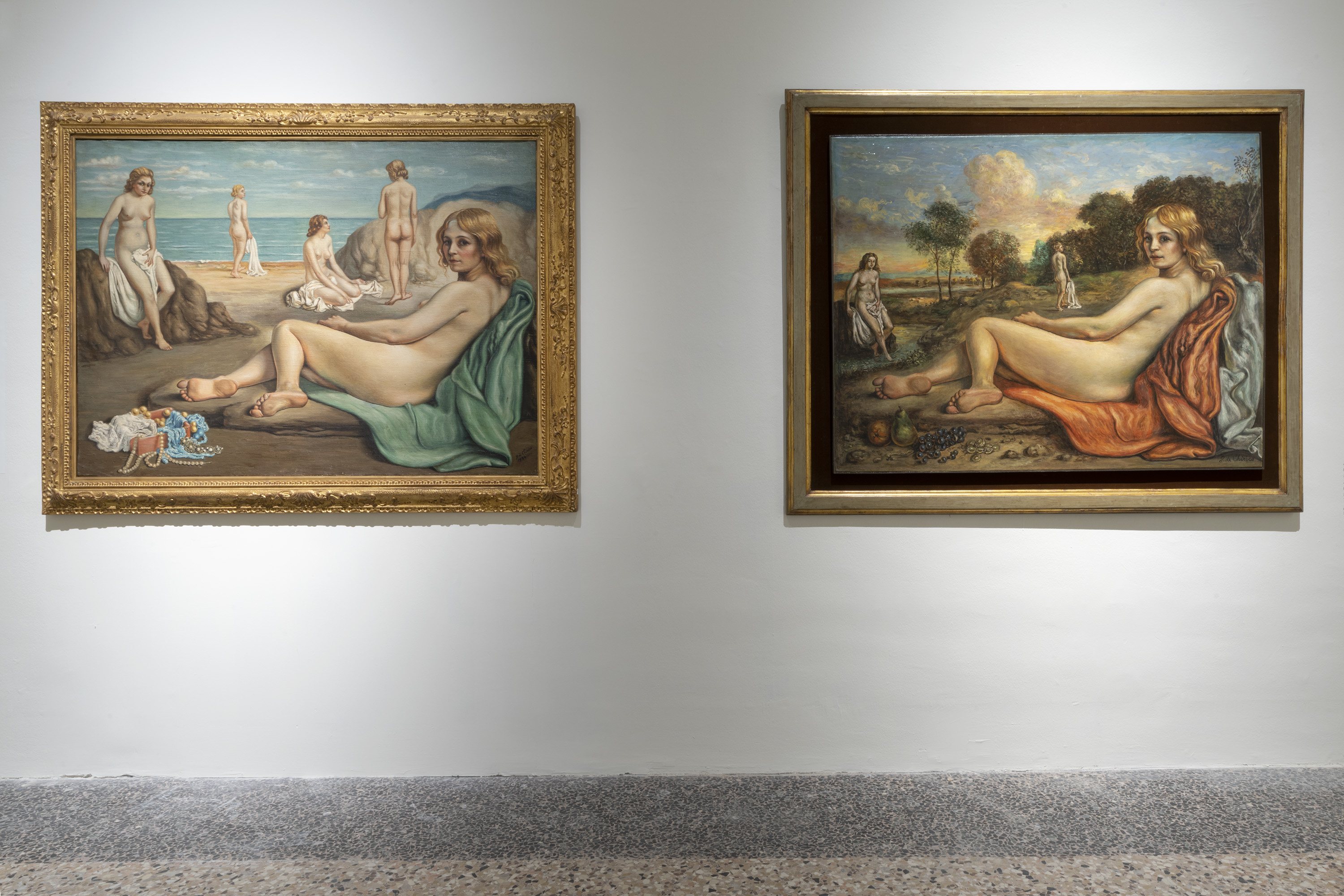 Oltre ad altri capolavori degli anni Venti, le opere dedicate ai Gladiatori, in mostra si trovano tre esemplari di Muse Inquietanti, Bagni Misteriosi (1934), è il dipinto affascinate che apre la serie dedicata a questo conturbante tema, ricorrente e longevo nella carriera di De Chirico, proposto sottoforma di litografie, che nel 1973 diventa tridimensionale grazie alla fontana realizzata a Milano in occasione della XV Triennale di Milano, oggi restaurata, segno di un’ arte partecipata, aperta anche ai cittadini.