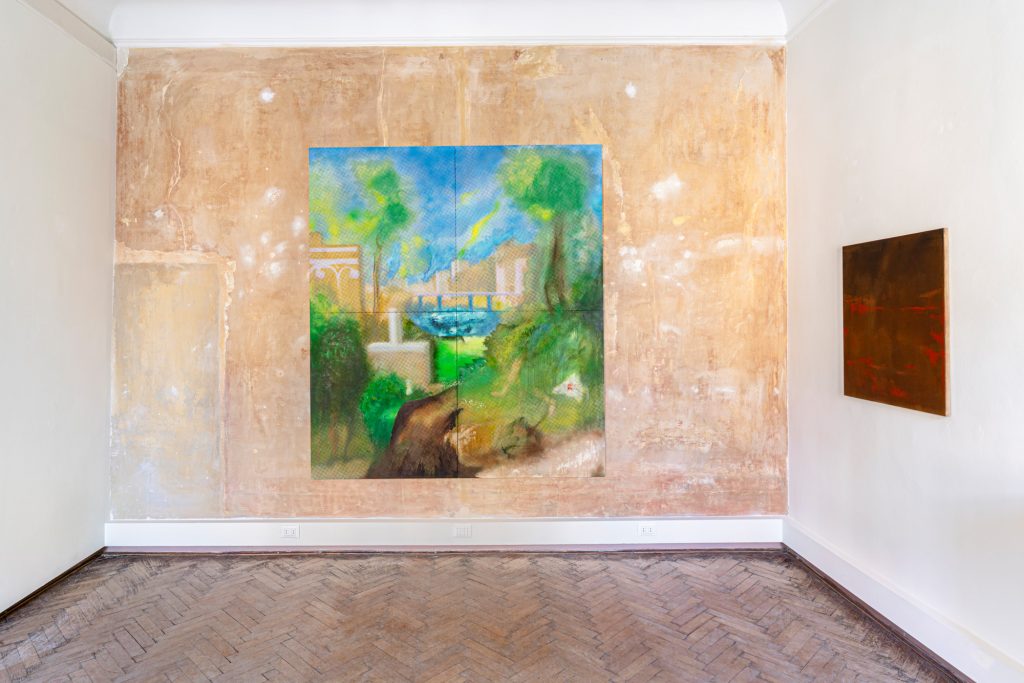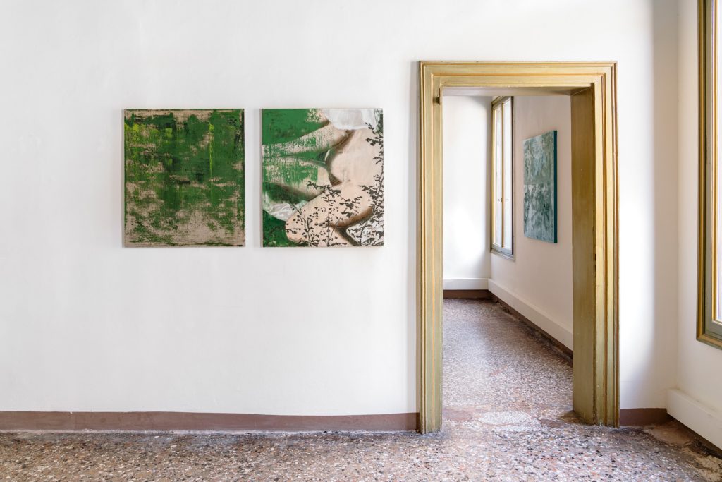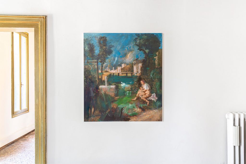 «Ciò che mi ha colpito» – dice l’artista, ex studente dell’Accademia di Belle Arti di Venezia – «è la relazione muta tra l’uomo e la donna. Un enigma che resiste, che non si lascia risolvere». Così anche le sue tele resistono alla chiarezza, al racconto, alla forma definitiva. La mostra si apre con una serie di lavori realizzati su riproduzioni ad alta risoluzione dell’opera di Giorgione, stirate nelle proporzioni, deformate, manipolate. Da queste basi Gualandi innesca un processo pittorico che alterna libertà e padronanza, fisicità e trasparenza, allusione e dissoluzione. Ogni opera è un esercizio di immersione: le figure si offuscano, il paesaggio si sgretola, la pittura prende il sopravvento.