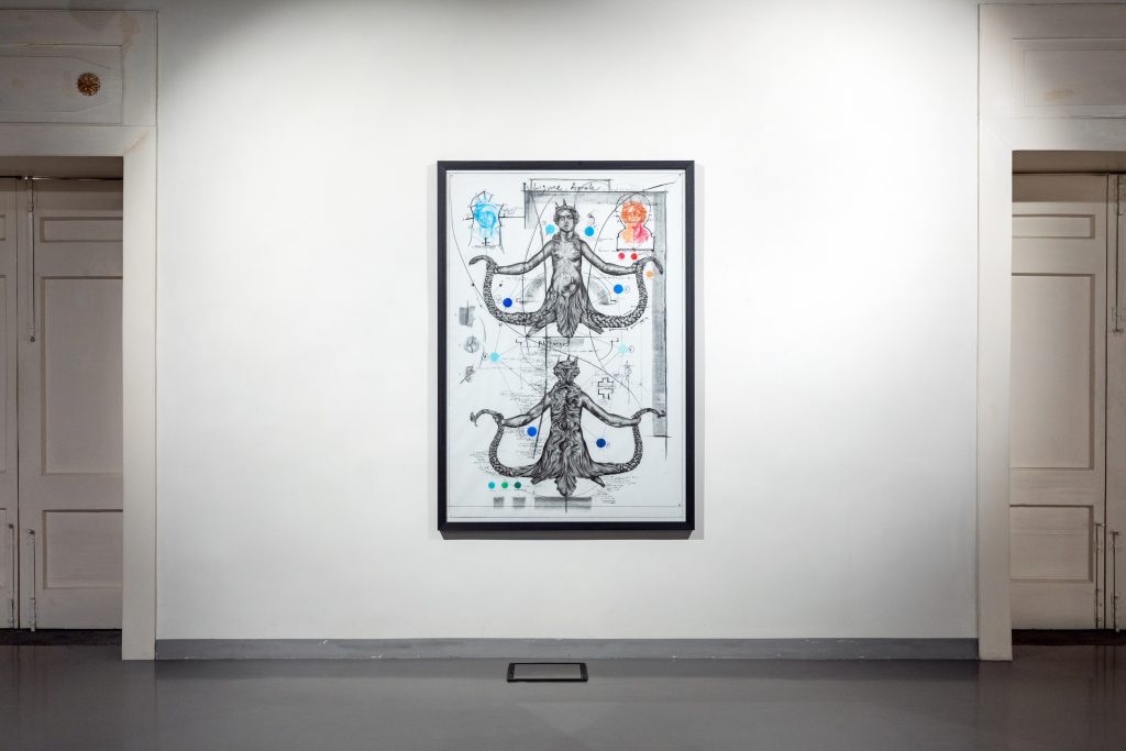 Quattro disegni a matita e pastelli di grandi dimensioni (160×120 cm) perimetrano il terzo piano: sono Babele, Ligure Aoide (un’altra parola usata da Omero per descrivere la voce delle sirene), Wunderkammer e Natura Morta con eclisse e Sirena, e affiancano, laterlamente, la grande parete dedicata a Sehnsucht, un’installazione di 24 disegni a biacca e foglia d’oro su carta nera francese. Sehnsucht è una parola tedesca che esprime l’anelito, struggente, bramoso, desiderante e dipendente, verso qualcosa di irraggiungibile.
