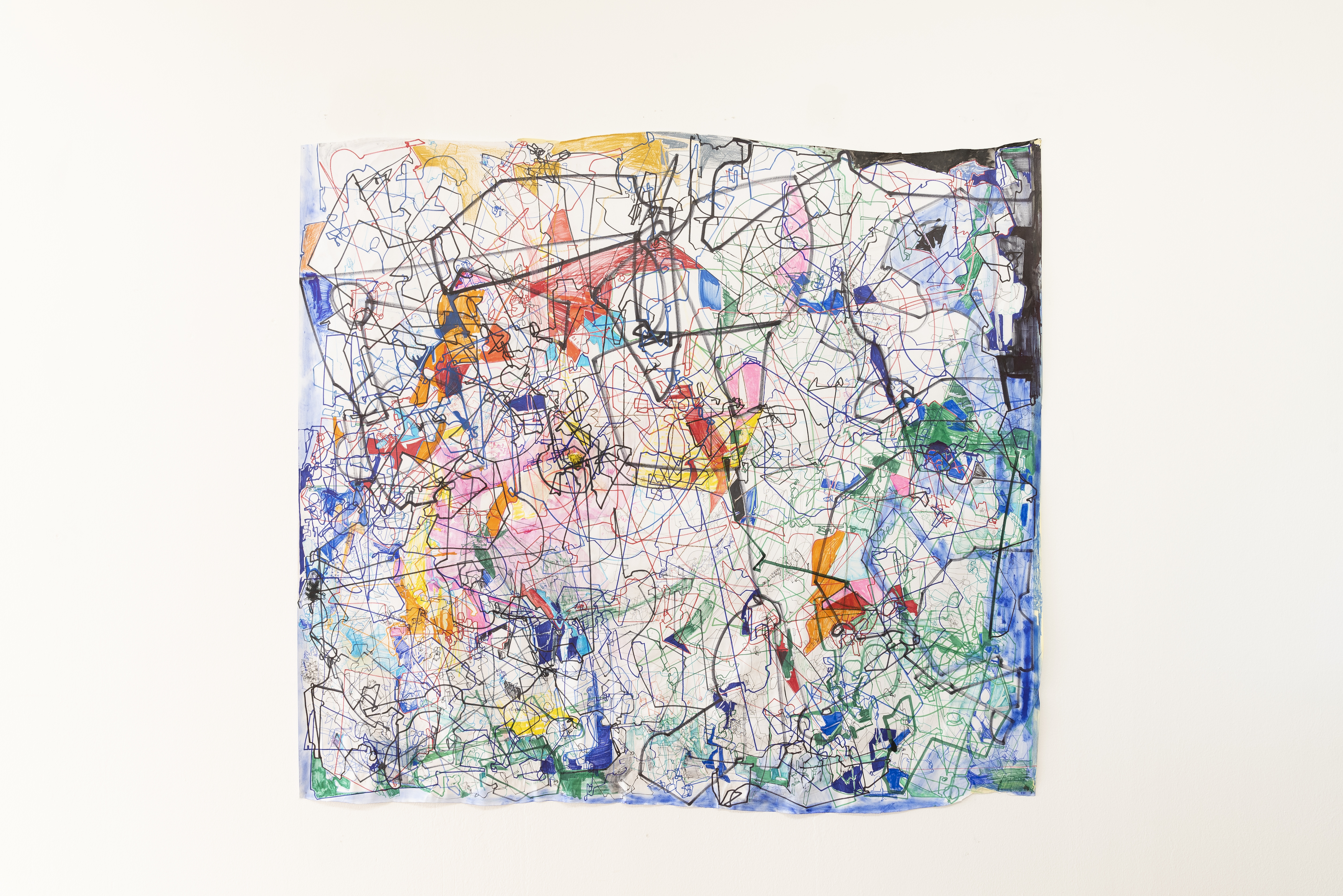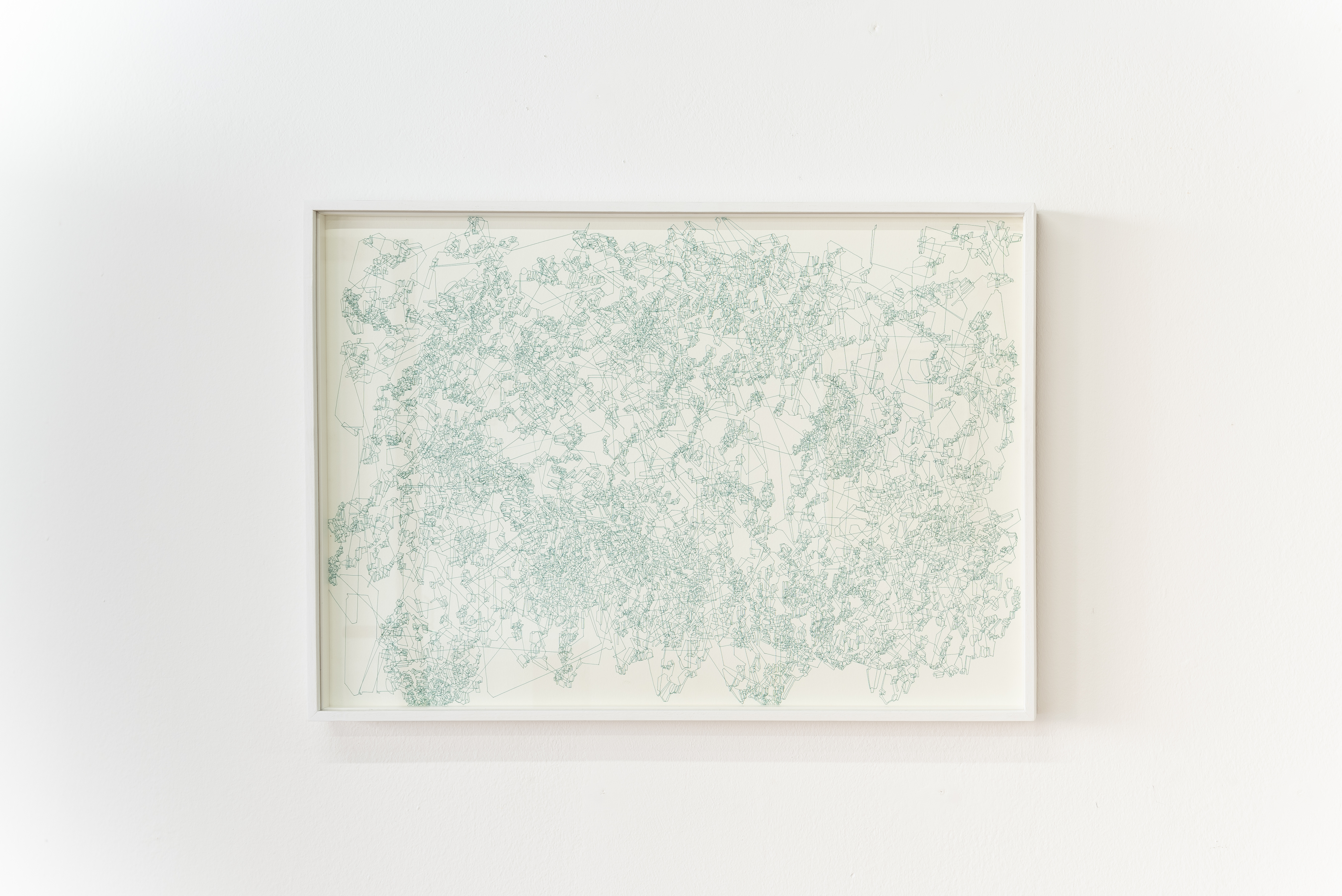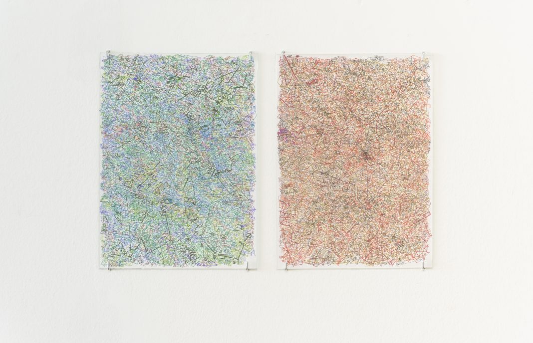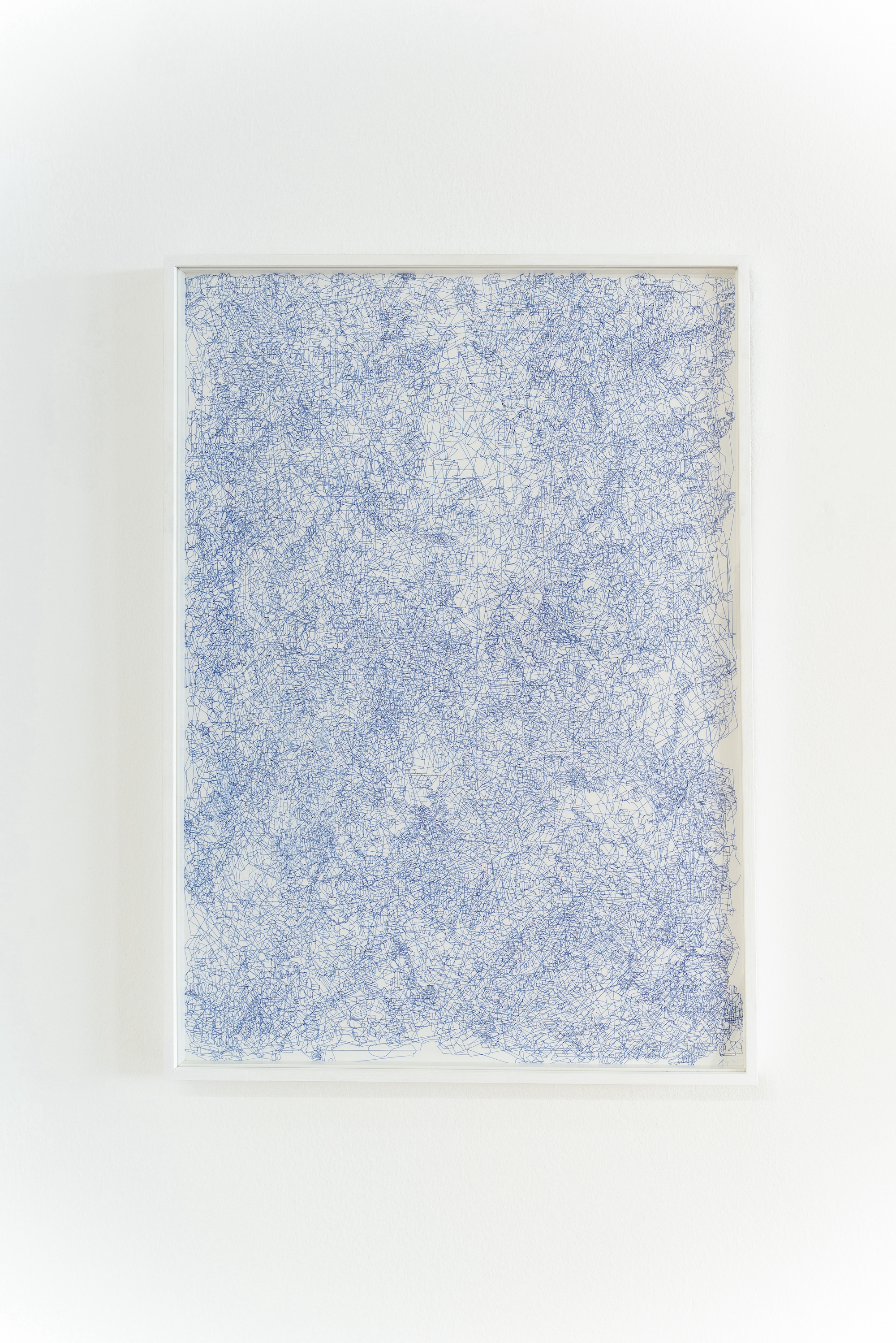 Lo spazio raccolto e asettico della galleria si costella di complessi paesaggi di linee, segni, sistemi che si scoprono ad ogni passo, avvicinandosi all’opera. Disegni che raccontano un viaggio, all’interno del proprio io, delle proprie paure, in una dimensione costruita dalla penna che scorre sul foglio.