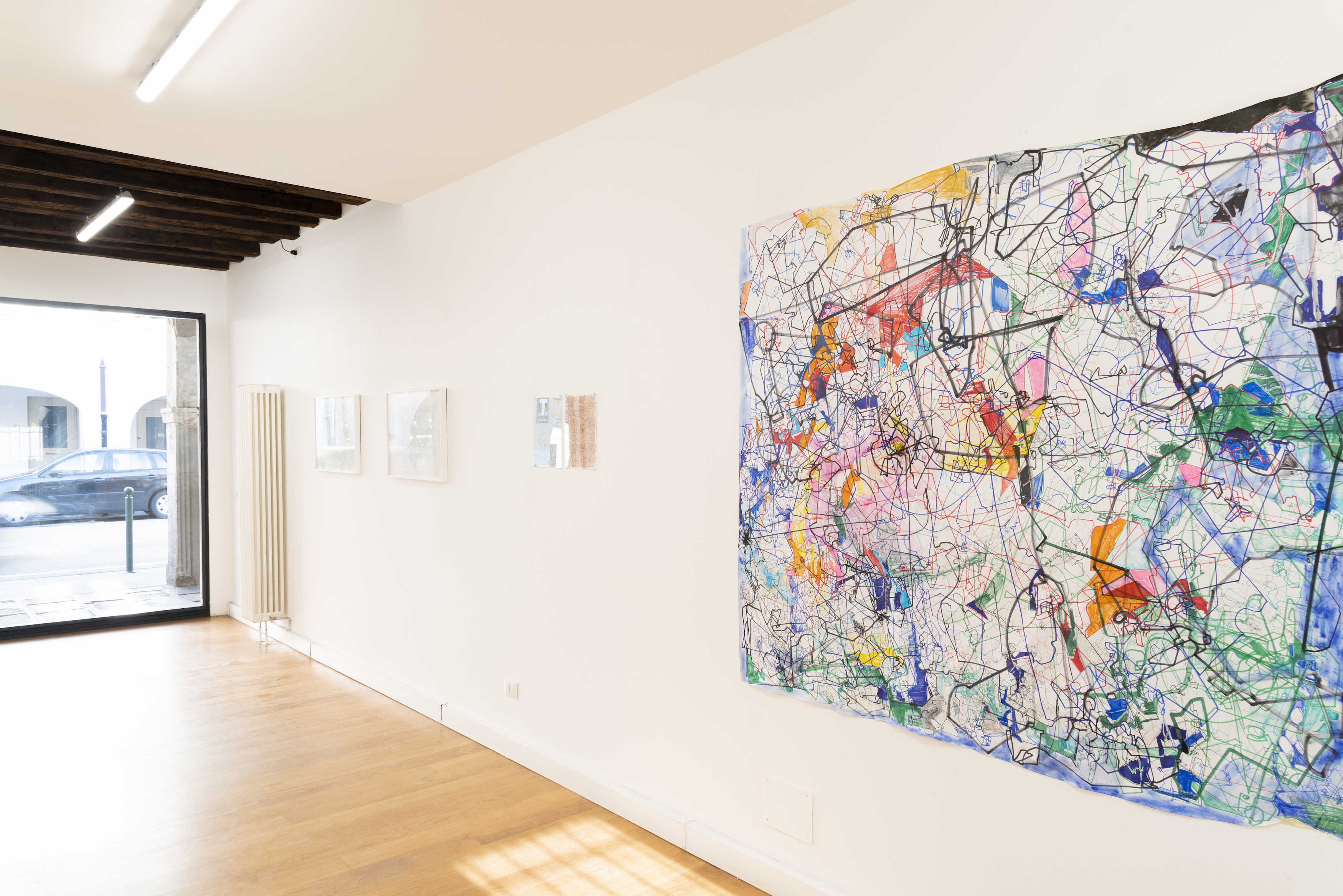La mostra comprende alcuni lavori monocromatici che, nel tempo, sono stati seguiti da due piccoli colorati in cui le linee si sovrappongono di più, infittendo la trama, fino a sembrarmi delle nebulose.