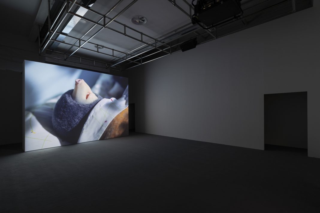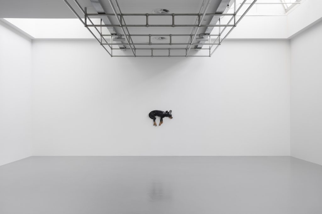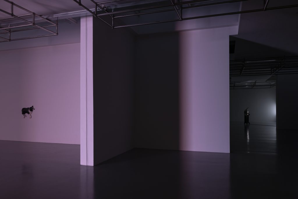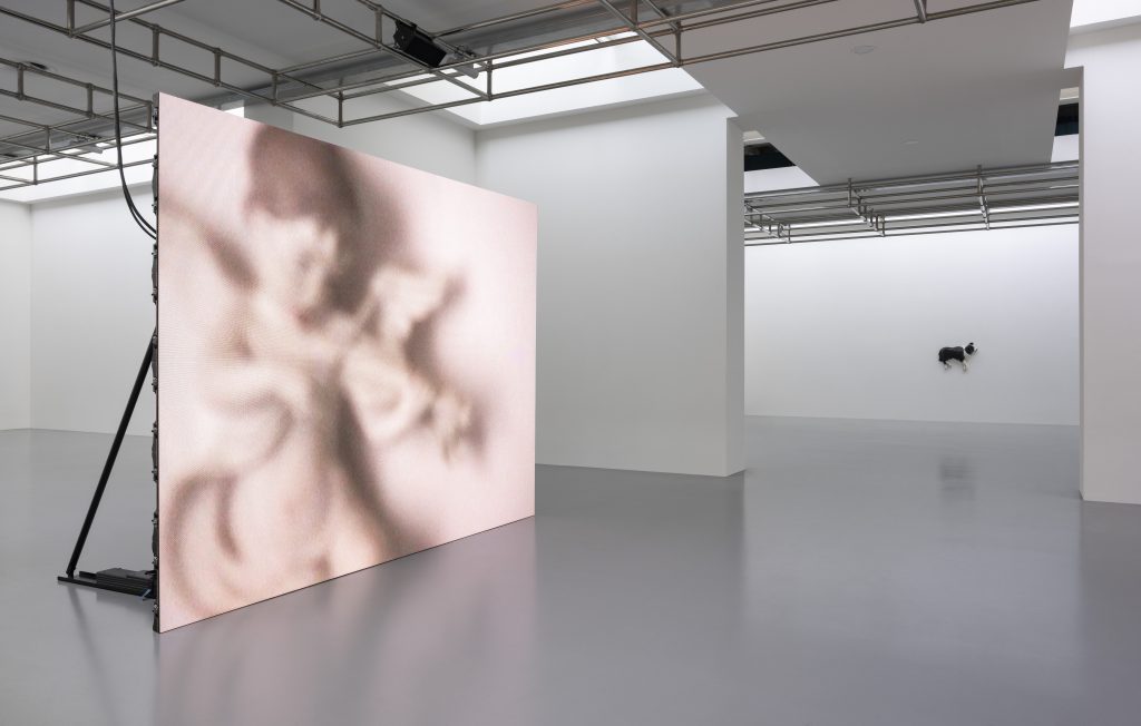 La gestione dello spazio tra i vuoti e i display, l’incanto dell’infanzia che si infrange con il progetto di morte dell’essere umano, la giocosità intuitiva degli animali che si spegne con le ceramiche di Cani morti e incontra un cortocircuito con le talpe robotiche del film Dolle. Il flirt tra linguaggio scultoreo e cinematografico di Diego Marcon si appropria degli oltre 1000 metri quadrati offerti dal Centro Pecci per ospitare il più ambizioso progetto espositivo mai realizzato dall’artista e per celebrare, a 35 anni dall’apertura dell’istituto museale, l’architettura ideata da Italo Gamberini nel 1988. E proprio la conversazione tra la configurazione architettonica, le opere, gli schermi e gli inediti interventi curati dall’architetto Andrea Faraguna suggeriscono come l’approccio di Marcon si sviluppi in quello spazio liminale che ricongiunge cinema e arti visive all’interno di una scenografia in cui anche la luce e il trattamento del vuoto giocano la loro parte. Non a caso infatti, le dieci sale dell’ala Gamberini sono illuminate solo per mezzo dei lucernari a soffitto: l’ingresso della luce naturale unita alla dilatazione dell’allestimento invitano il pubblico a esplorarne gli ambienti con una curiosità quasi infantile, complice anche la scelta di non riportare alcuna didascalia e approfondimento testuale. Gli interstizi d’ombra, bilanciati talvolta dalla luminosità dei display, dialogano con l’ingresso dell’ambiente esterno, come nel caso della grande finestra appositamente ritagliata da Marcon e Faraguna che, tra visione e vertigine, si affaccia sull’iconica antenna realizzata nel 2006 dall’architetto olandese Maurice Nio. «Le sale Gamberini del Centro Pecci sono sempre state una delle mie architetture museali preferite. Forse anche per questo la progettazione della mostra ha preso forma con estrema naturalezza» afferma l’artista. E, di fatti, la configurazione ad anello del Centro Pecci combacia tanto con l’indagine di Marcon attorno al ciclo fisiologico che lega vita e morte quanto alla struttura del video in loop utilizzata dall’artista per sollecitare la vulnerabilità dell’individuo.