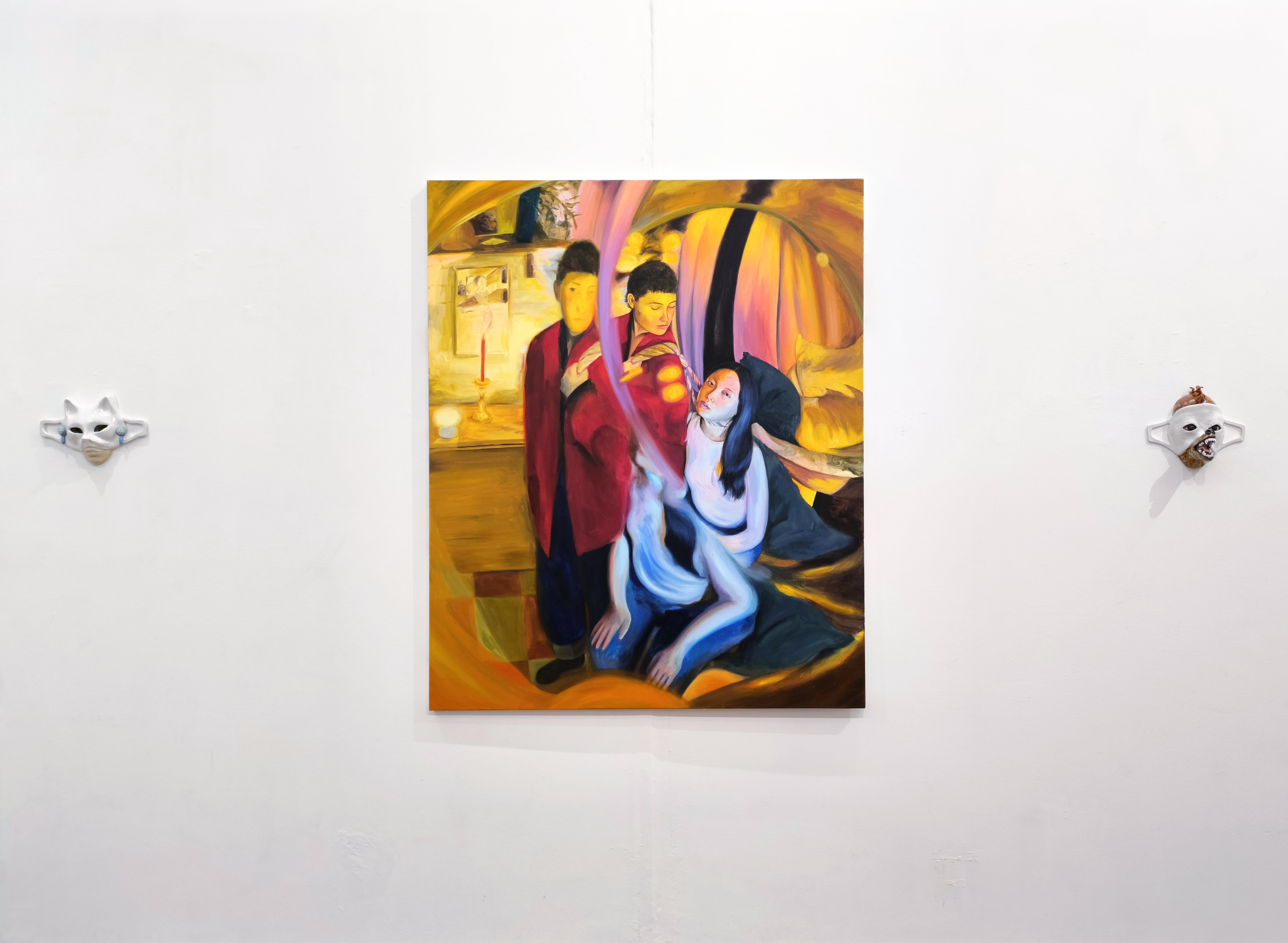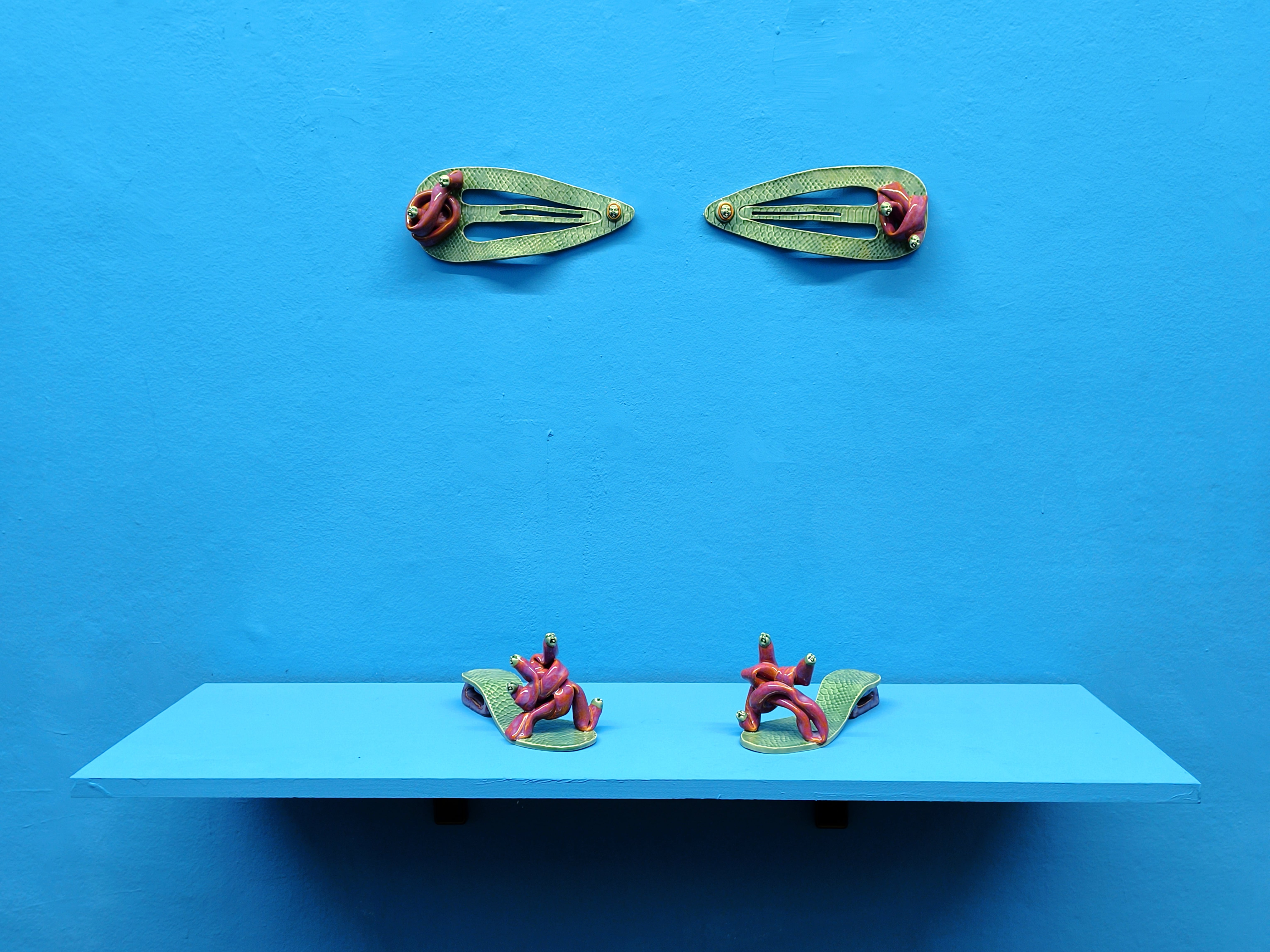 Nella mostra A Hyena Wore My Face Last Night, attraverso sculture in ceramica e pittura, Stevenson e Peace raccontano la dimensione femminile come spazio di sdoppiamento, sulla scia dell’interesse surrealista per le maschere, gli animali e la metamorfosi, ricordandoci quanto sia importante non darla vinta al conformismo.