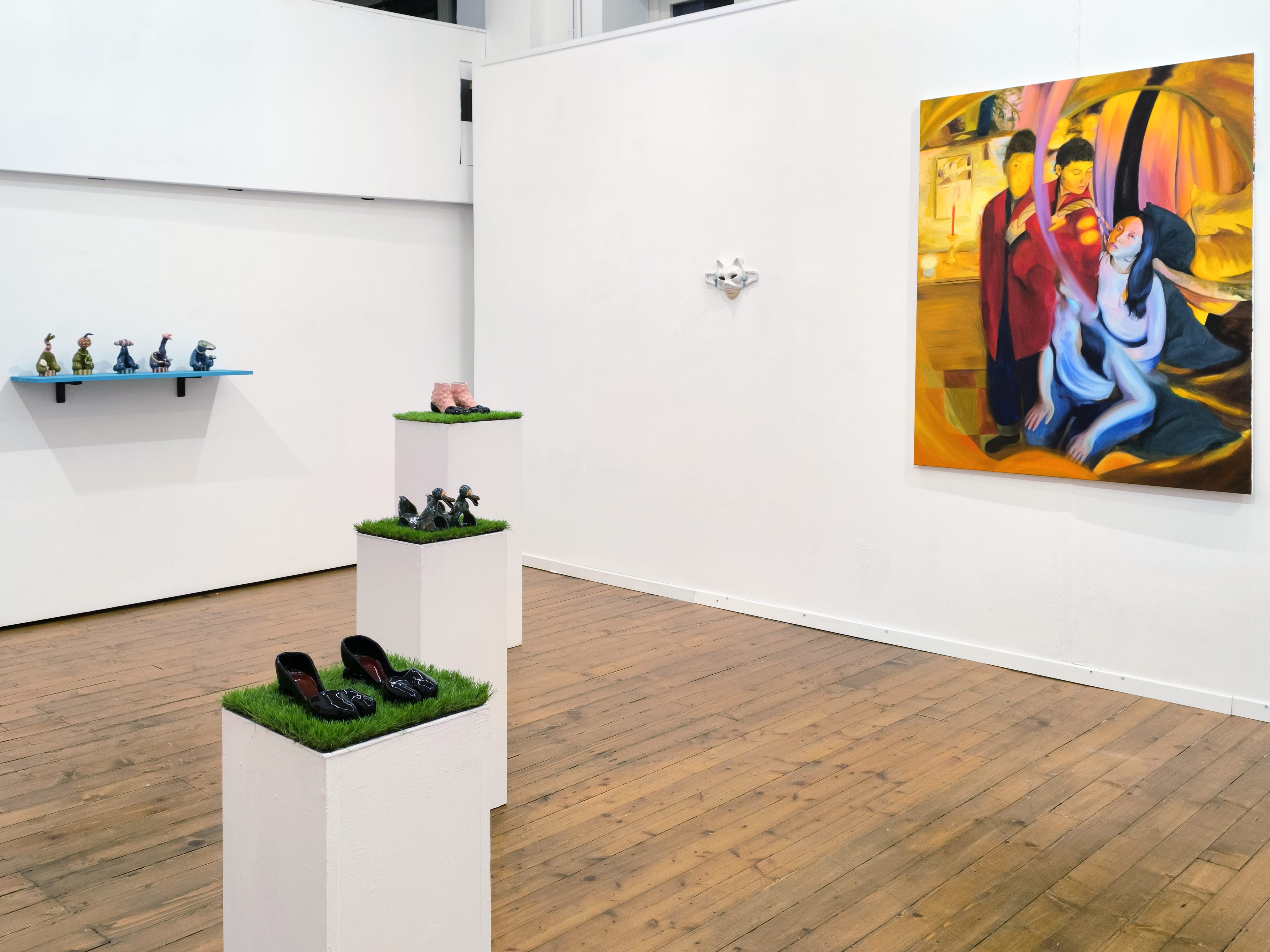 Da C+N Canepaneri Stevenson presenta un gruppo di nuove sculture in ceramica, in cui titoli citano testualmente frasi tratte dal racconto della Carrington. Una serie di cinque bizzarre figure, intitolate I feel I’m in very good form (2025) rappresentano la fame feroce della iena, mentre iconiche scarpe in ceramica a forma di tacchi in stile tabi suggeriscono zampe e zoccoli, richiamando l’interesse surrealista per la scarpa come oggetto di feticcio, ma anche l’identificazione tra donna e animale di cui parla Carrington.