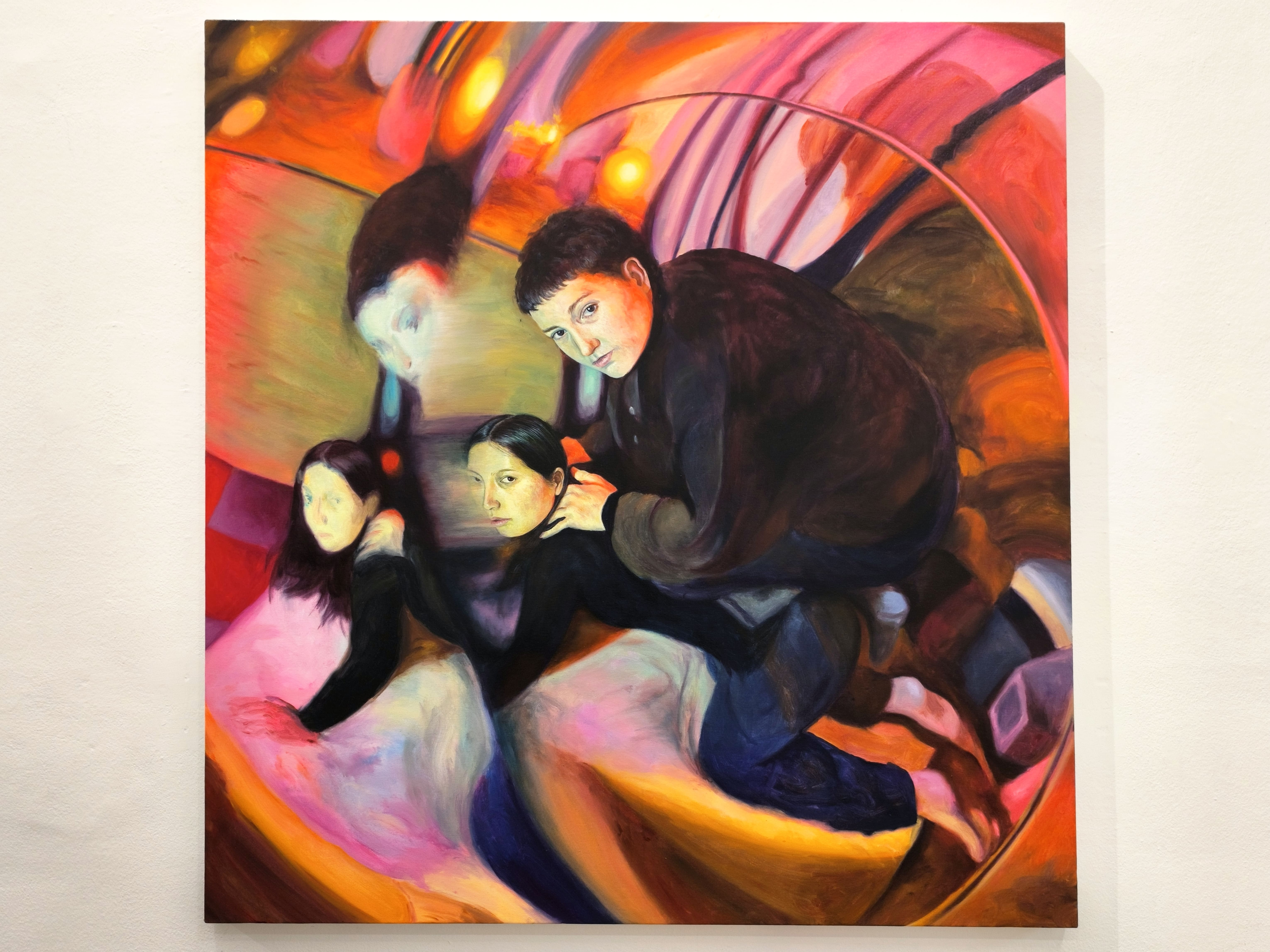 Amelie Peace (Cannes, Francia, nel 1997), giovane artista queer, francese con base a Londra, mette in discussione le norme sociali legate all’intimità femminile. Attraverso i suoi dipinti, Piece ci trasporta all’interno di attimi di intimità rubati, dove possiamo sorprendere enigmatiche dinamiche relazionali tra figure femminili, forti e vulnerabili allo stesso tempo. Sbirciando attraverso una lente che sdoppia e deforma le figure, diventiamo spettatori indiscreti di scene private, gesti ambigui e atteggiamenti a volte animaleschi.