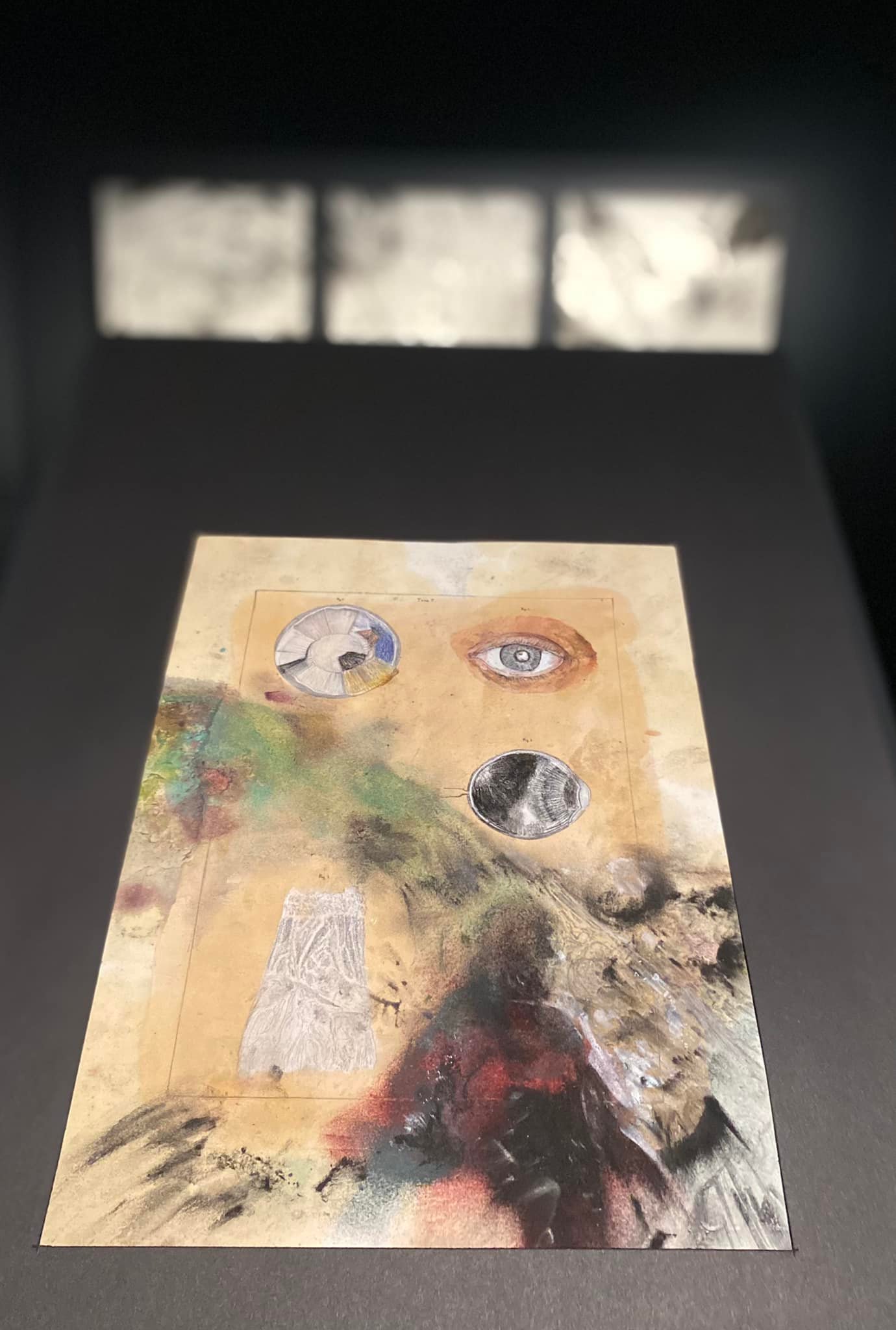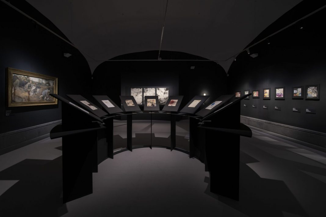 Risulta perciò temeraria la sfida della mostra di Andrea Bolognino, “Cecità, accecamento, oltraggio” a cura di Sylvain Bellenger, con l’assistenza di Luciana Berti e Francesca Dal Lago, per il settimo appuntamento del ciclo “Incontri Sensibili” al Museo e Real Bosco di Capodimonte di Napoli. 24 disegni su carta realizzati a matita, carboncino, acquerello e acrilico diluito, che osano sfidare lo Zeitgeist della nostra epoca. Quello di una costante, battente, opprimente schiavitù visiva. Un’avventura non solo percettiva ma tecnica, ideologica e filosofica. Un gioco con gli scuri, sin dalla sala che accoglie le opere in penombra, illuminata da tenui fasci di luce che ne accarezzano la carta, le forme e i colori. Così distanti dai risplendenti ori della Crocifissione di Masaccio o della Corona della Madonna dell’Umiltà, che pervadono i corridoi del Museo.