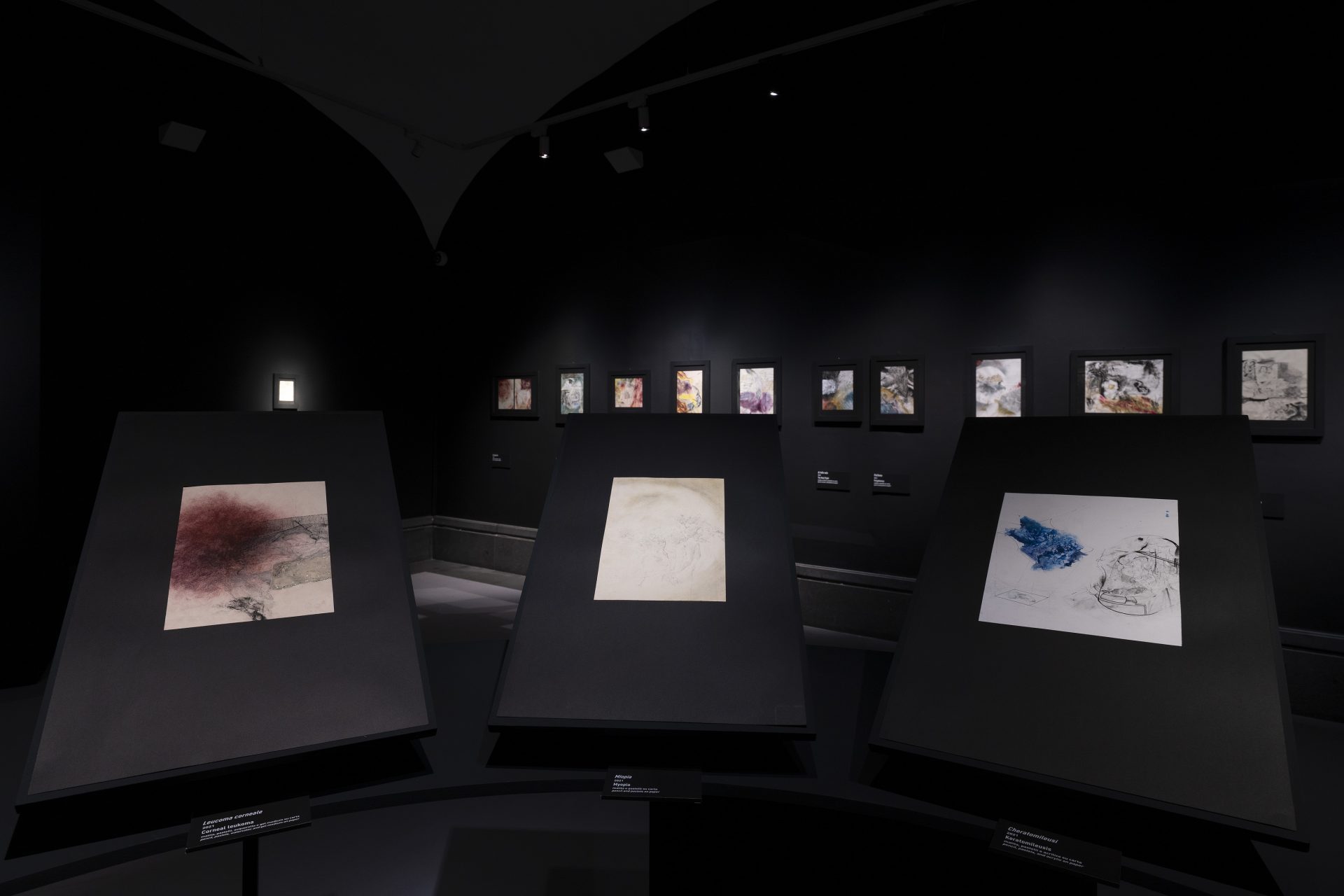 Come nella nebulosa di fiori, colori, campi, volti e mani di Oltraggio (2021), che si affastellano simili a scene a metà tra il ricordo della vista e l’oblio della mente, dove luci e bagliori rasentano l’estasi di una cecità ricolma di sensualità dimenticate e riconquistate. Come nei tratti legamentosi di Presbiopia (2021), che sembra scandagliarci con circospezione e timore. O come nell’opprimente Leucoma Corneale (2021) che, con la sua consistenza pulsante e nebulosa, ci ipnotizza e ci cattura simile a un pensiero ossessivo. Infine negli ori e cerulei di Fotofobia (2021) e Cheratomileusi (2021), sfolgoranti come pietre iridescenti su uno sfondo oculare di cellulosa.