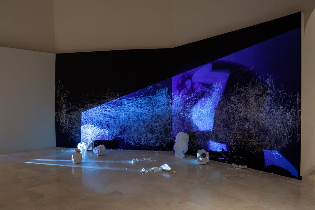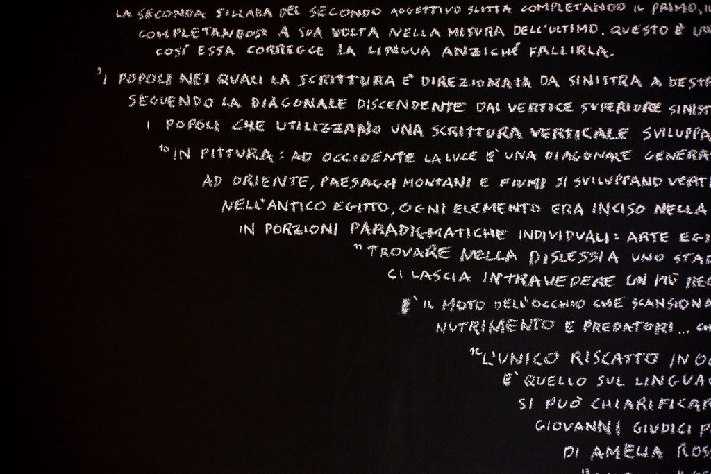 Gesso su parete nera, proiezione video in bianco e nero, dimensioni ambientali