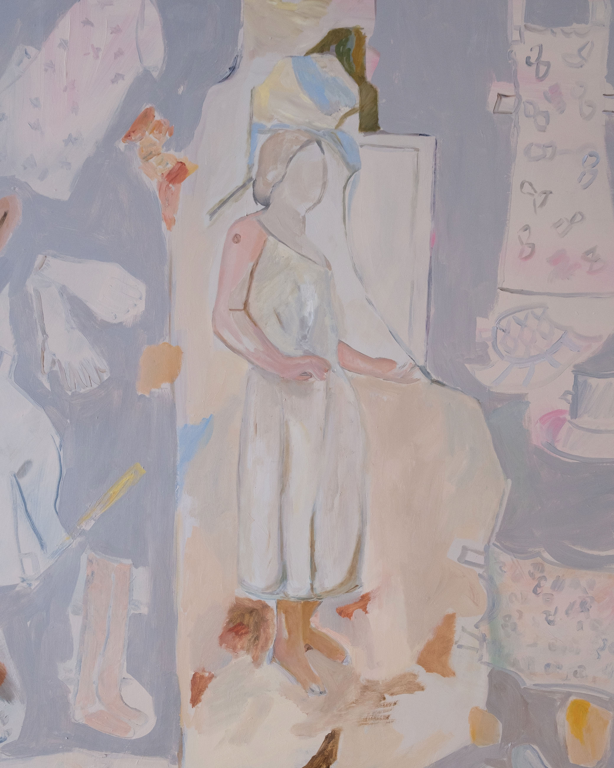 Nelle tele di Lorenza Boisi traspare l’esercizio della riscrittura privata dell’io, attraverso la composizione di un album famigliare, niente affatto autoreferenziale, che si presenta anzi come un intreccio di visioni e ricordi condivisibili da molti. Il mondo fanciullesco di Boisi si presenta tuttavia nascosto dietro a un filtro, una patina del ricordo quasi malinconico, determinato dalla forza del tempo. Personaggi e atmosfere conosciute eppure lontane, percepibili forse solamente su altri piani astrali (The man who was many painters, olio su tela, 70×60 cm, 2019).