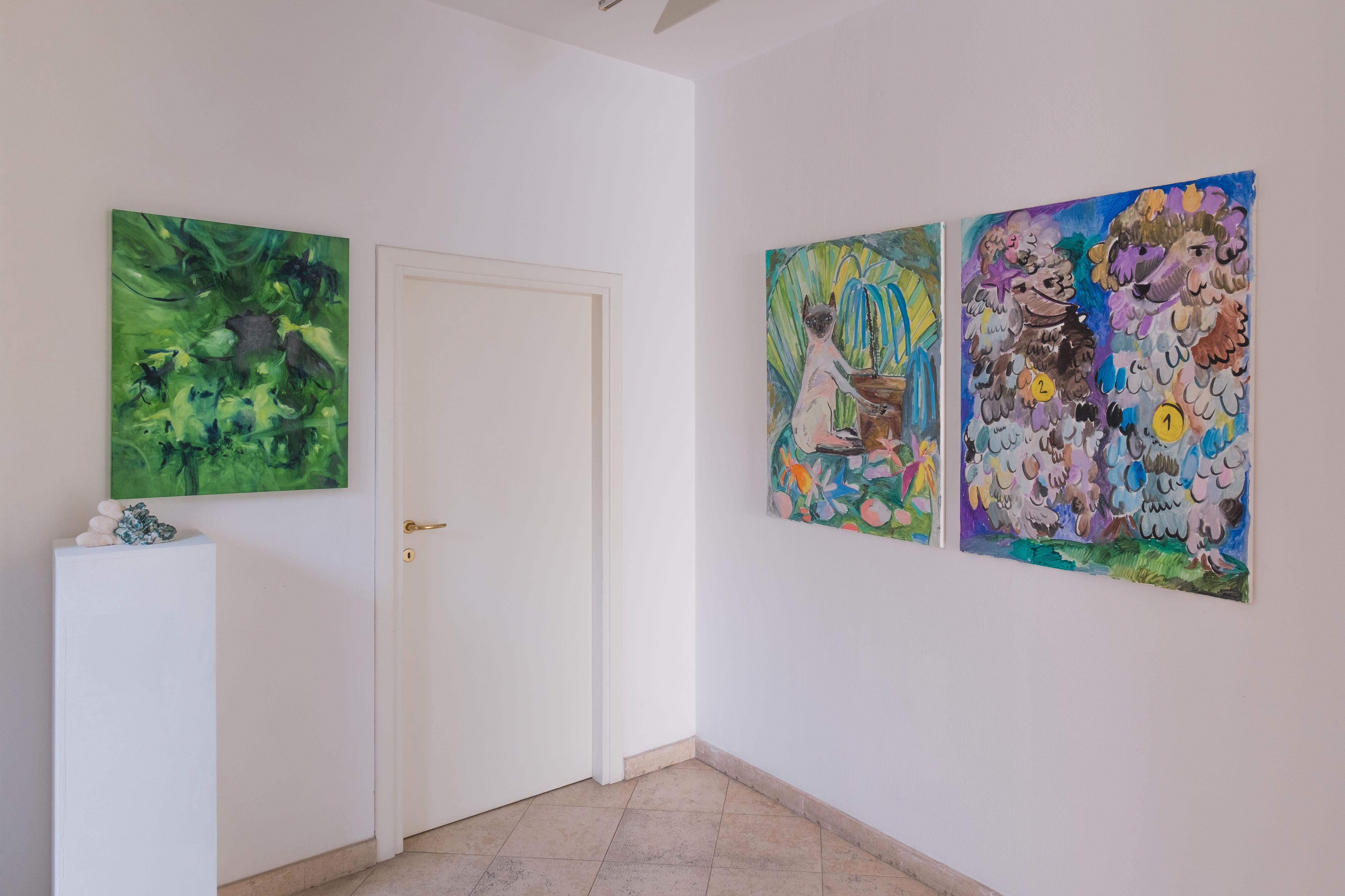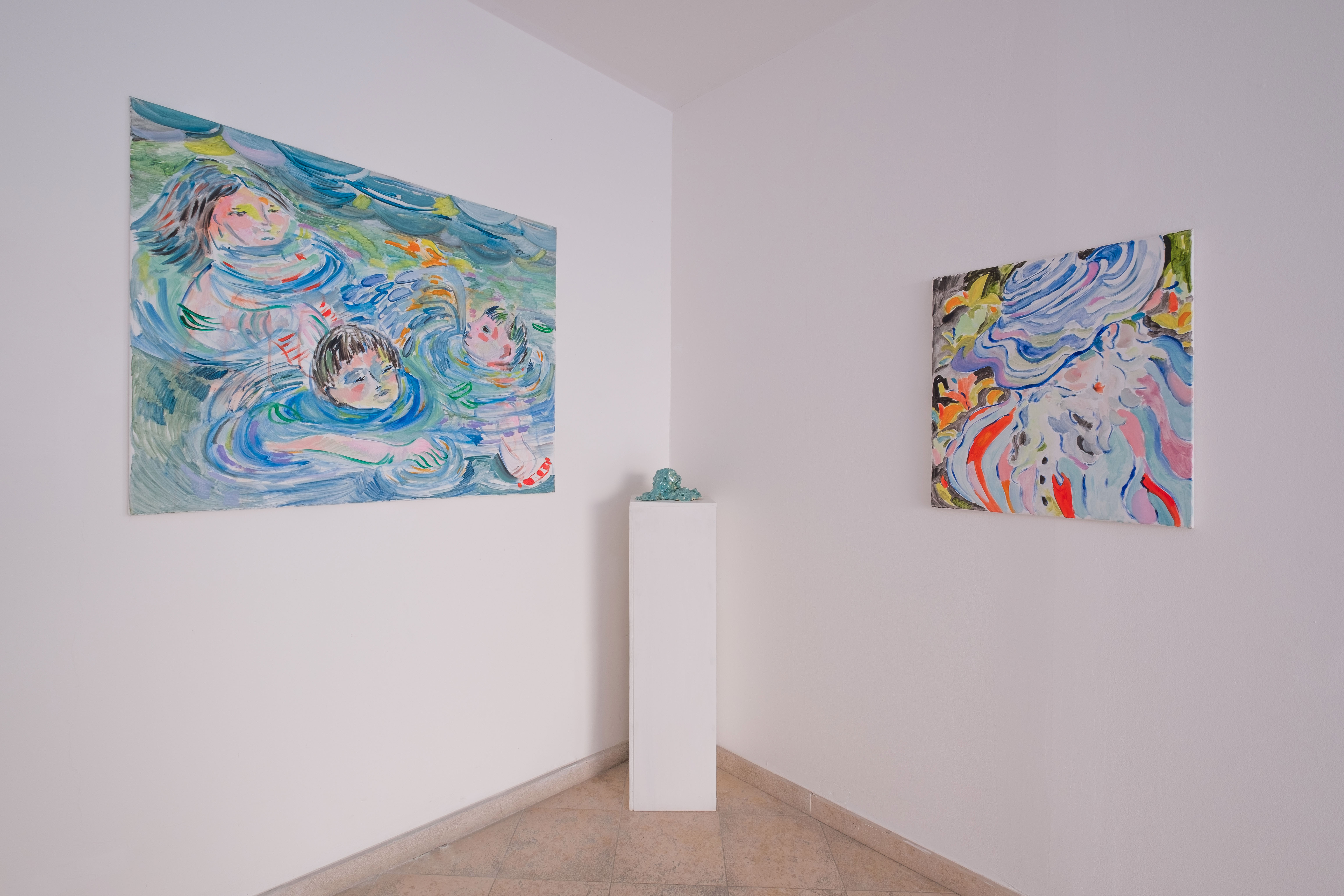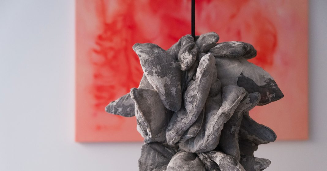 Infine, con le opere plastiche e pittoriche di Elisa Muliere entriamo in una sorta di irrealtà dove a governare è il gesto compositivo e dove le forme non sono immediatamente riconoscibili, smottate dalla loro anima (Totentanz, olio su tela, 140 x 120 cm, 2023). Muliere cripta i suoi riferimenti figurativi e ne rivela solo le tensioni le quali creano uno scambio fluido e rigenerativo tra avviluppamenti e distensioni filamentose, senza tempo. Vi è in campo anche la tecnica analitica di autoascolto, lasciando che conscio e inconscio comunichino attraverso la creatività. Proprio per questo è interessante anche la sua ultima sperimentazione tessile e sonora presente in mostra: Dancing. 30 km/s (cotone dipinto, lana, riempimento sintetico, registrazione sonora 1’13”).