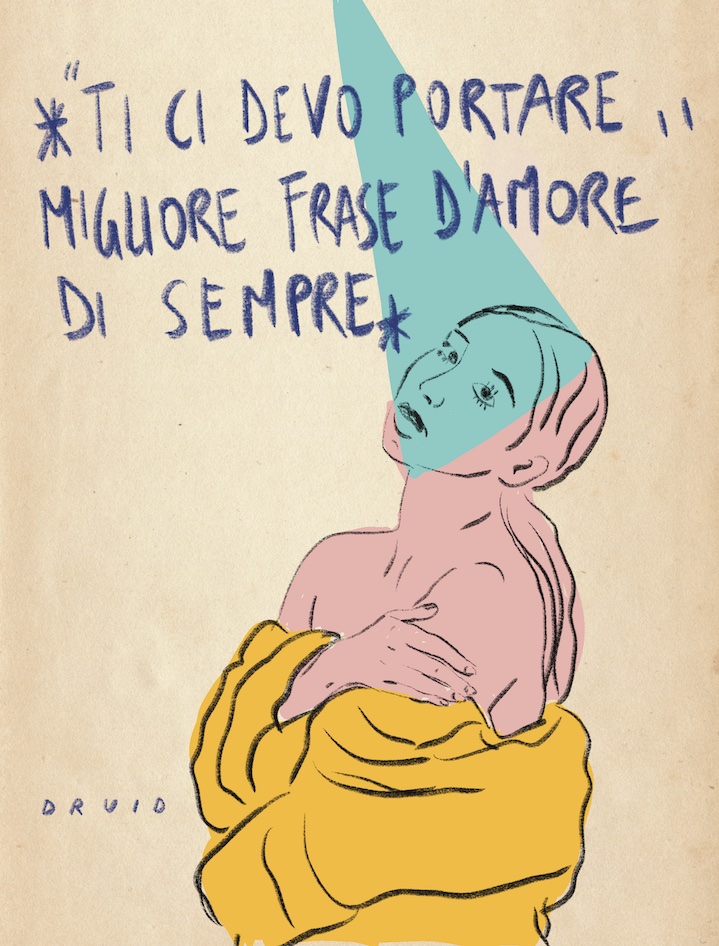 A far riflettere circa il retaggio colto dell’artista è il suo stesso pseudonimo; il nome “Druid” deriva dalle figure sacerdotali celtiche, depositarie di un sapere mistico che consentiva di accedere a quella saggezza insita nel termine stesso. L’intento perseguito da Napolitano non è molto dissimile da coloro i quali mutua il suo nome de plume, data l’incisività delle massime che cristallizza su tele e disegni. “Non inseguire chi sa dove trovarti” e “Ti ci devo portare-migliore frase d’amore di sempre” sono solo alcune delle sentenze che l’artista concepisce come suggello all’intervento pittorico, rivelando una profonda attenzione alle dinamiche che regolano i rapporti sociali, scevre da qualsiasi pregiudizio sociale o di genere. Ciò che emerge dalla produzione dell’artista romano è la predilezione per il femminile, che viene presentato come emancipato dall’oggettificazione del pensiero maschile ed emerge con un’autonomia dissacrante, consapevole di celare a volte una malinconia che comporta solitudine. La profonda consapevolezza del panorama relazionale moderno induce Druid a semplificare senza banalizzare dinamiche complesse, che quasi sempre celano una molteplice lettura, in virtù di quella saggezza antica a cui si richiama, mediano tra complessità e vulgata.