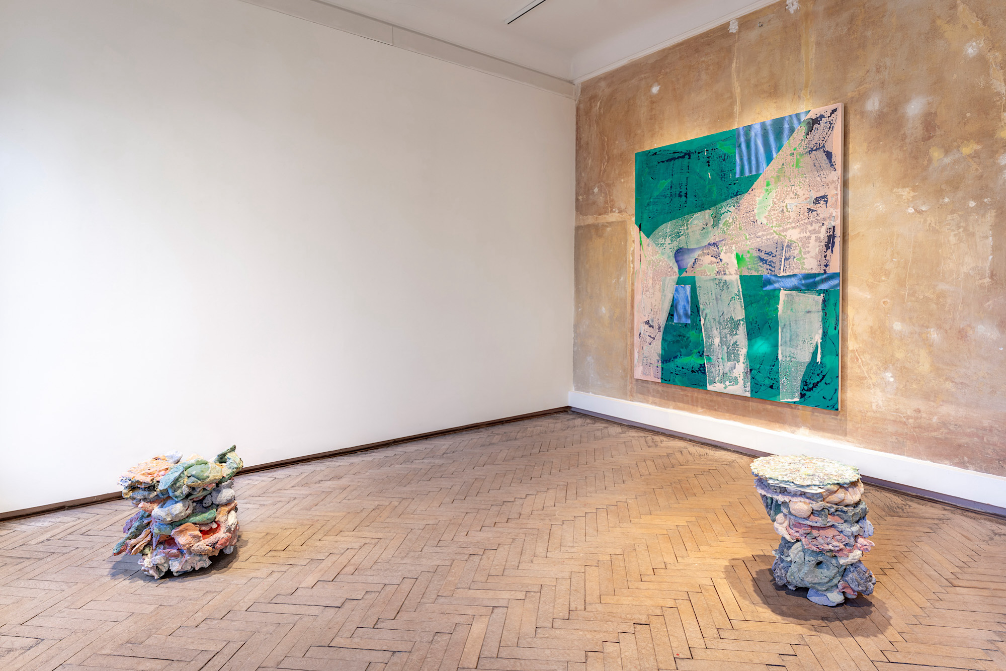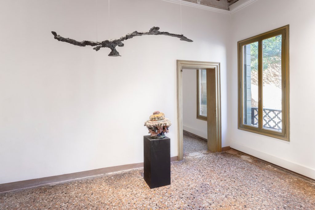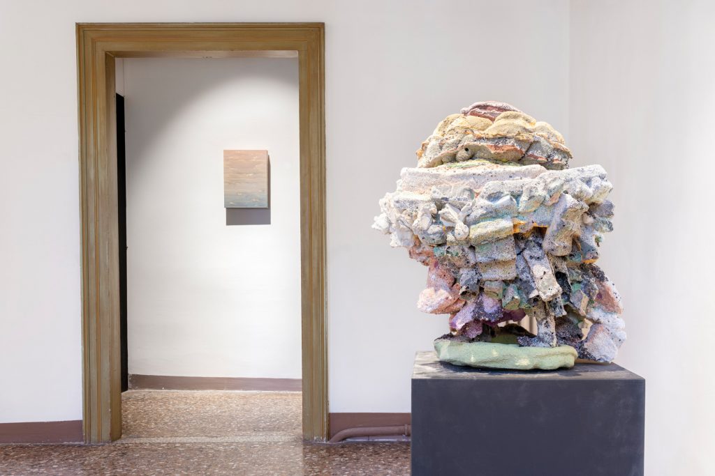 Le sculture di Alberto Scodro, infine, portano questa logica alle sue estreme conseguenze. Composte da silice, pigmenti e metalli, esse evocano formazioni geologiche, concrezioni minerali che sembrano provenire da un tempo radicalmente altro rispetto a quello umano. La loro presenza nello spazio espositivo introduce una temporalità profonda, in cui la distinzione tra naturale e artificiale perde progressivamente significato. Ciò che appare davanti allo spettatore è il risultato di reazioni chimiche, variazioni termiche e processi fisici che eccedono la pura intenzione artistica.