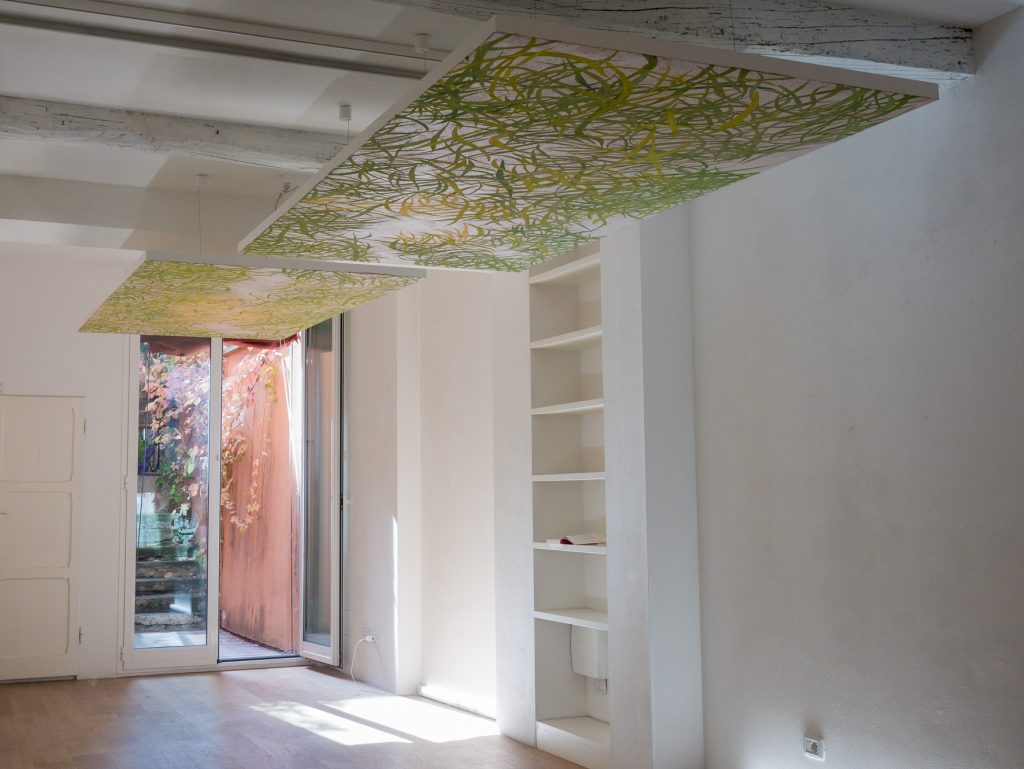 Un breve passaggio basso e stretto che conduce lo spettatore nella seconda sala della galleria nella quale la Baroncini ci mostra il suo personalissimo giardino “segreto” che si concretizza in due pannelli di grandi dimensioni sospesi a soffitto. Nel dittico, realizzato con pittura a secco su intonaco, è evidente la volontà di ripercorerre oggi le tecniche di affresco tipiche dei maestri del passato tenendo fede al proprio segno pittorico. Una comunicazione tra interno ed esterno quella tra il lavoro ed il piccolo giardino, questa volta “reale”, situtato al termine dello spazio espositivo nel cuore della città.