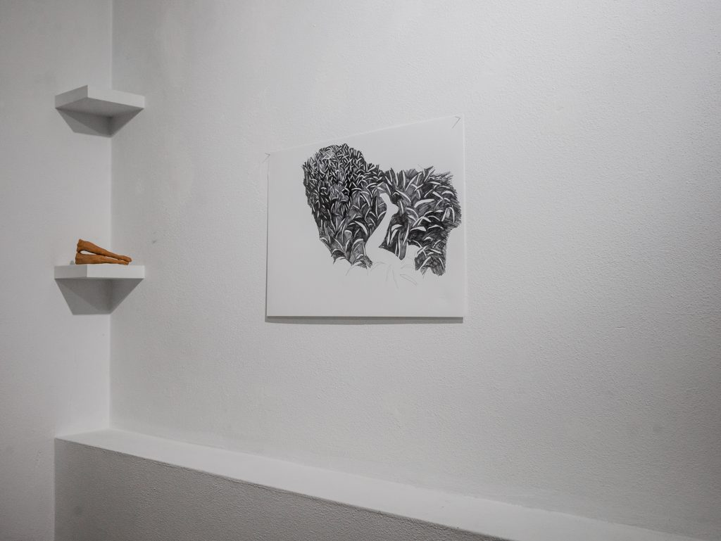 Tributo all’omonimo racconto di David Foster Wallace, dal quale l’operazione ha preso il titolo, il percorso espositivo da Nelumbo comincia con alcuni disegni a grafite in cui Baroncini rappresenta frammenti di giardini ideali nei quali il colore è assente, ma la cui presenza si percepisce chiara, in attesa di essere identificata, come nel caso del protagonista del racconto che, interloquendo con MayFly, sembra in primis quasi rinnegarlo. Poi, una maniglia di terracotta che incarna due piccole gambe indica la portcina in verde acquamarina.