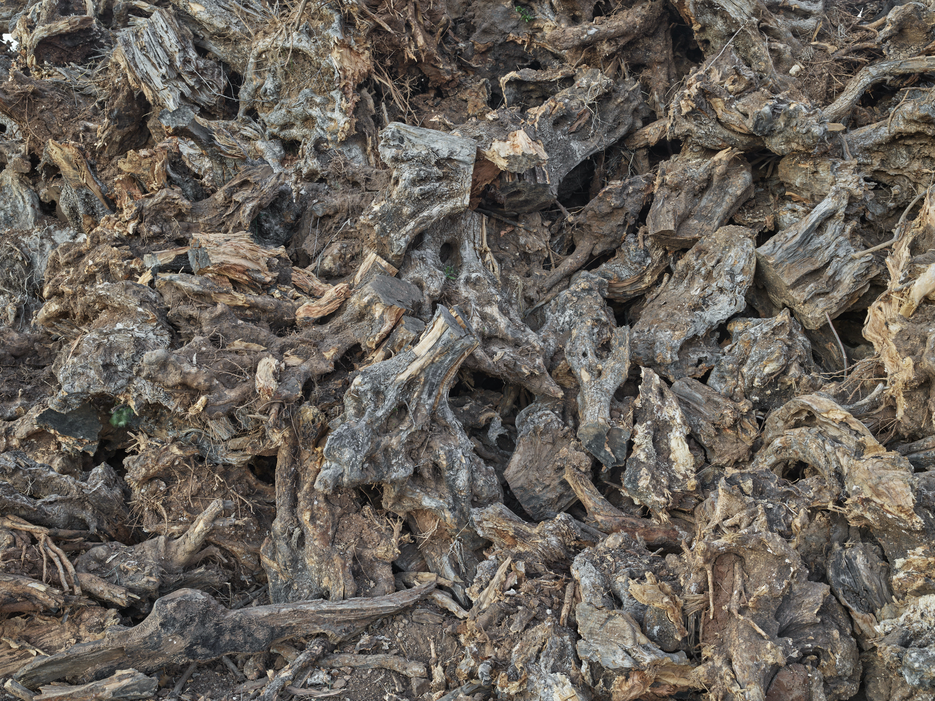 La prosecuzione dell’esperienza di visita spinge lo spettatore ad essere consapevole del processo di logoramento del ciclo naturale fino a rivolgersi al repertorio di certi boschi incantati dove gli alberi prendono vita: è il caso dell’opera Xylella Studies #20 nella quale dal tronco si leva una figura che ricorda quello di un uomo sfiancato immerso in un clima di lenta sospensione, è lo stesso artista ad attingere alla sfera del magico con queste parole: «I vecchi alberi morenti paiono dare vita a una foresta incantata. Il mio non può essere, per quanto scientifico, un lavoro distaccato, c’è della bellezza anche nel ritrarre la tragedia, altrimenti non saremmo qui a guardare queste foto». Il cerchio si chiude con un cumulo di rami, Xylella Studies #16, un mosaico ligneo di pezzi incastrati in modo armonico e disperato. “Nel caos c’è la fertilità”, sosteneva Anaïs Nin ed è questo il senso più profondo del lavoro di Burtynsky, uno scenario apocalittico in cui emerge prepotente il verde circostante che ci ricorda che c’è vita, dopotutto.