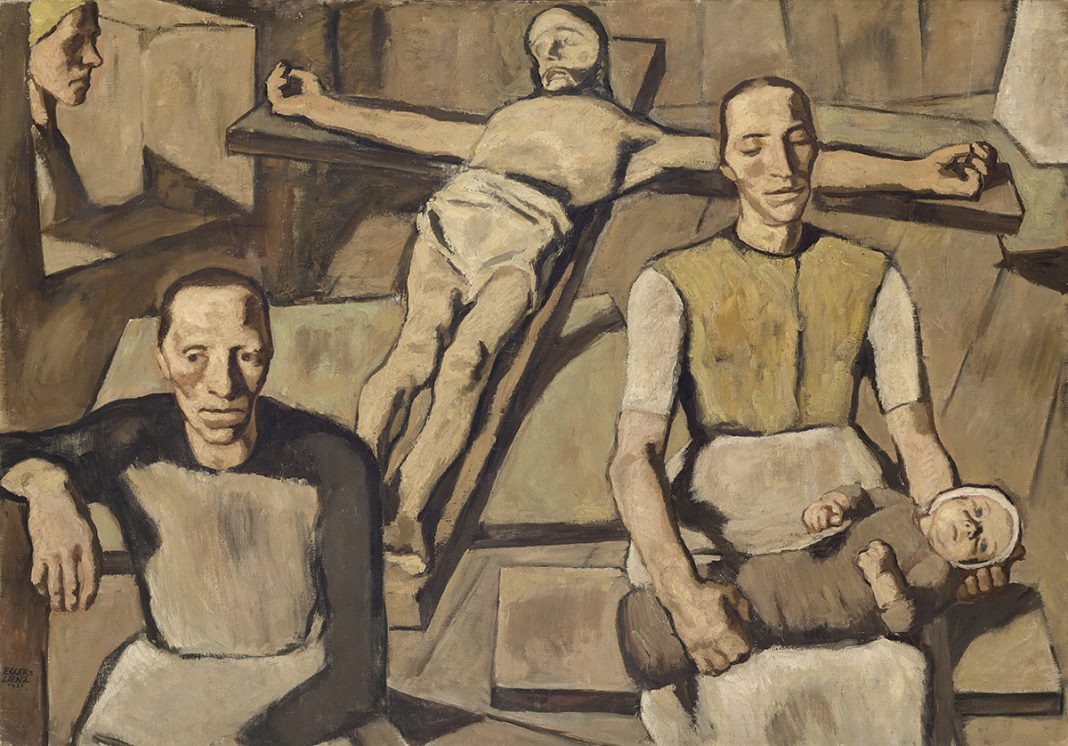 Nessuno e tutti i destini sono racchiusi nei grandi dipinti a olio del pittore austriaco: figure plastiche, monumentali, con le spalle sempre chine sotto un peso – se non della battaglia, del lavoro, del dolore, della vita. Svuotate di ogni individualità e quindi universali, capaci di rappresentare l’umanità. Decomposizione, strazio, visioni da incubo e odore di morte e ogni inimmaginabile miseria umana è raccontata invece nella serie di incisioni di Otto Dix, “Der Krieg“ (1924).