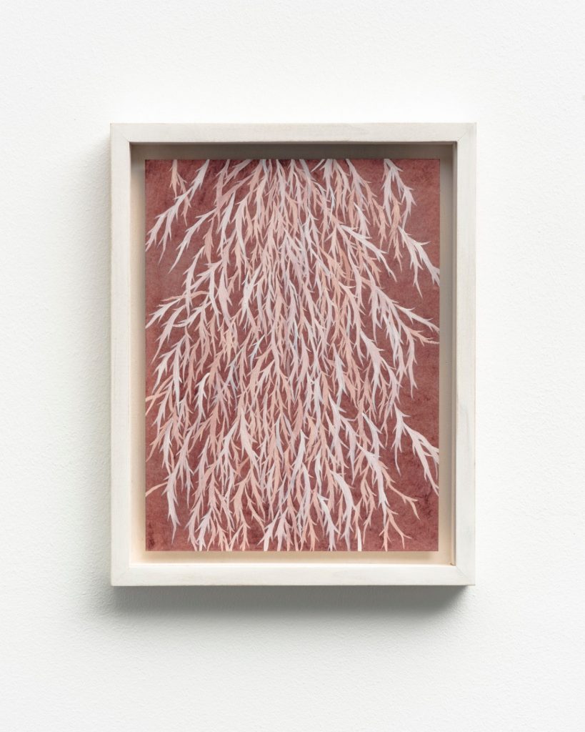 Agnes Martin è la traccia di questo corpo di lavori. Deschens parrebbe un esercizio lezioso e abile. E poi Luc Tuymans, riconoscibile e speciale grazie all’esplicito tributo che Bertaglia ha espressamente elaborato ponendo in relazione uno degli elementi riconoscibili dell’artista (le forme degli alberi) con la sua pratica pittorica, più rumorosa, movimentata, in costante mutamento. Diversi dal suo percorso sono anche quei teschi che si accumulano come montagne di morte colorata, o i fiori leziosi che, dipinti come un fittizio ornamento, ma una densa stratificazione stilistica, richiamano quei viaggi in oriente che Elisa aveva affrontato in media diversi come ad esempio quello della ceramica e della carta leggera. E poi il colore che non è mai uniforme, ma è composto da particelle organiche che evadono, si alzano, riscendono dalla carta e dalle tele. Sono degli sfondi elaborati e particolarissimi, che non si ritrovano altrove, sono solo lì.