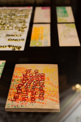 Ma “Crepita la carta” principia e si estende anche nel catalogo, confezionato artigianalmente in 100 copie numerate, progettato da Lucamatteo Rossi e curato da Giorgiomaria Cornelio e Andrea Balietti, che accoglie i contributi di Bianca Battilocchi, Gabriella Cinti e Marco Giovenale. Un libro-oggetto pregiato, immancabilmente, visto il suo contenuto, realizzato con carte differenti per ogni pagina dalle storiche Grafiche Fioroni, in cui alle copertine dei libri d’arte esposti in mostra (dalle “Idrologie” a “brunt H”, da “L’homme qui descend quelque: Roman Metamytique” a “Green”) si alternano lacerti, appunti sparsi, pagine manoscritte e labirinti verbovisivi dell’autore e a cui aggiungono cartoline ad opera di Francesca Torelli.