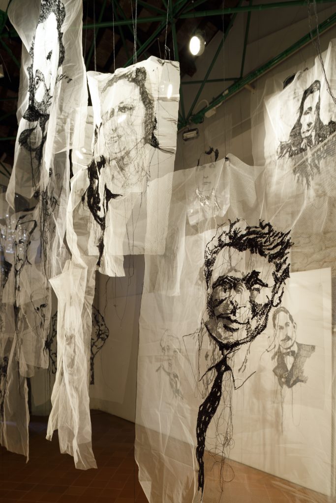 «Eron, street artist di livello internazionale, da anni impegnato sulla concezione di tempo e memoria, individuale e storica, presenterà la serie degli “oggetti”, veri e propri oggetti di uso quotidiano che l’artista recupera in strada o in mercatini, dove con un uso incredibile della vernice spray, ricrea volti e figure sospese, interpretando graficamente quello che potrebbe essere un ricordo. Una simile intenzionalità guida Lucia Nanni che, con la macchina da cucire, tesse su tulle e canape quello che rimane di una vecchia fotografia sbiadita, di un pensiero annebbiato che nel tempo sarà destinato a scomparire. Due artisti quindi così lontani per tecnica ma così vicini negli intenti, due maestri estetici in grado di portare messaggi potenti, universali e sempre attuali. Le opere, allestite sia nella Galleria comunale che nell’adiacente Museo della Regina, intendono dialogare con la collezione permanente, investendo lo spazio di nuove prospettive e facendo coesistere l’antico e il contemporaneo» hanno spiegato gli organizzatori.