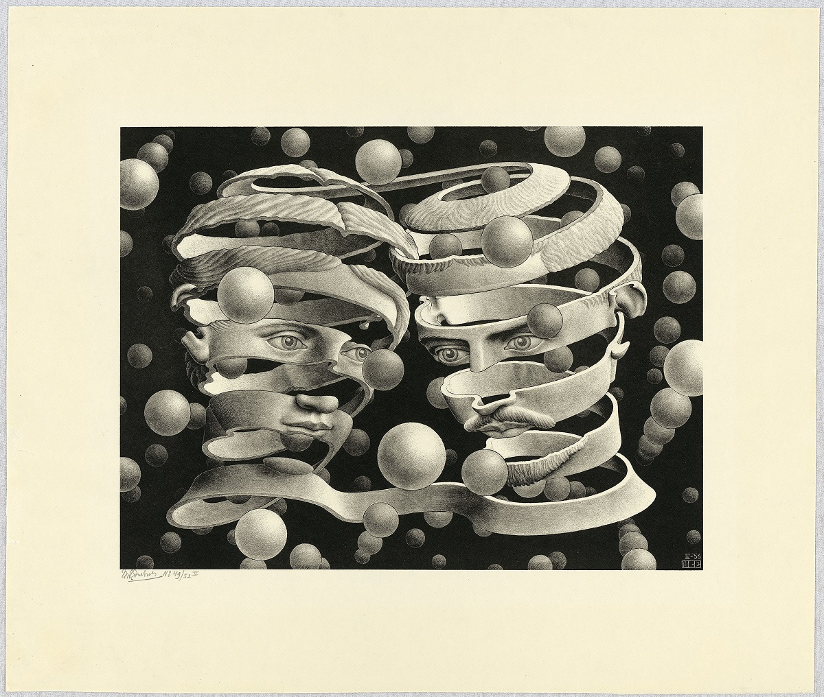 A partire dalla metà degli anni ‘30, infatti, Escher si era staccato dalla rappresentazione euclidea dello spazio. Il suo crescente interesse per la matematica e la geometria passa attraverso lo studio e il fascino che esercitano su di lui sfere, superfici riflettenti, solidi geometrici o ancora superfici topologiche come il nastro di Möbius, un oggetto percepito come superficie a due facce ma che, a una più attenta osservazione, ne dimostra una sola. Potremmo parafrasare un suo commento alla litografia Mano con sfera riflettente (1935), in questo modo: la sfera, riflettendolo, racchiude in sé tutto lo spazio circostante, al cui centro si staglia proprio colui che la guarda; l’uomo è quindi il centro di questo universo.