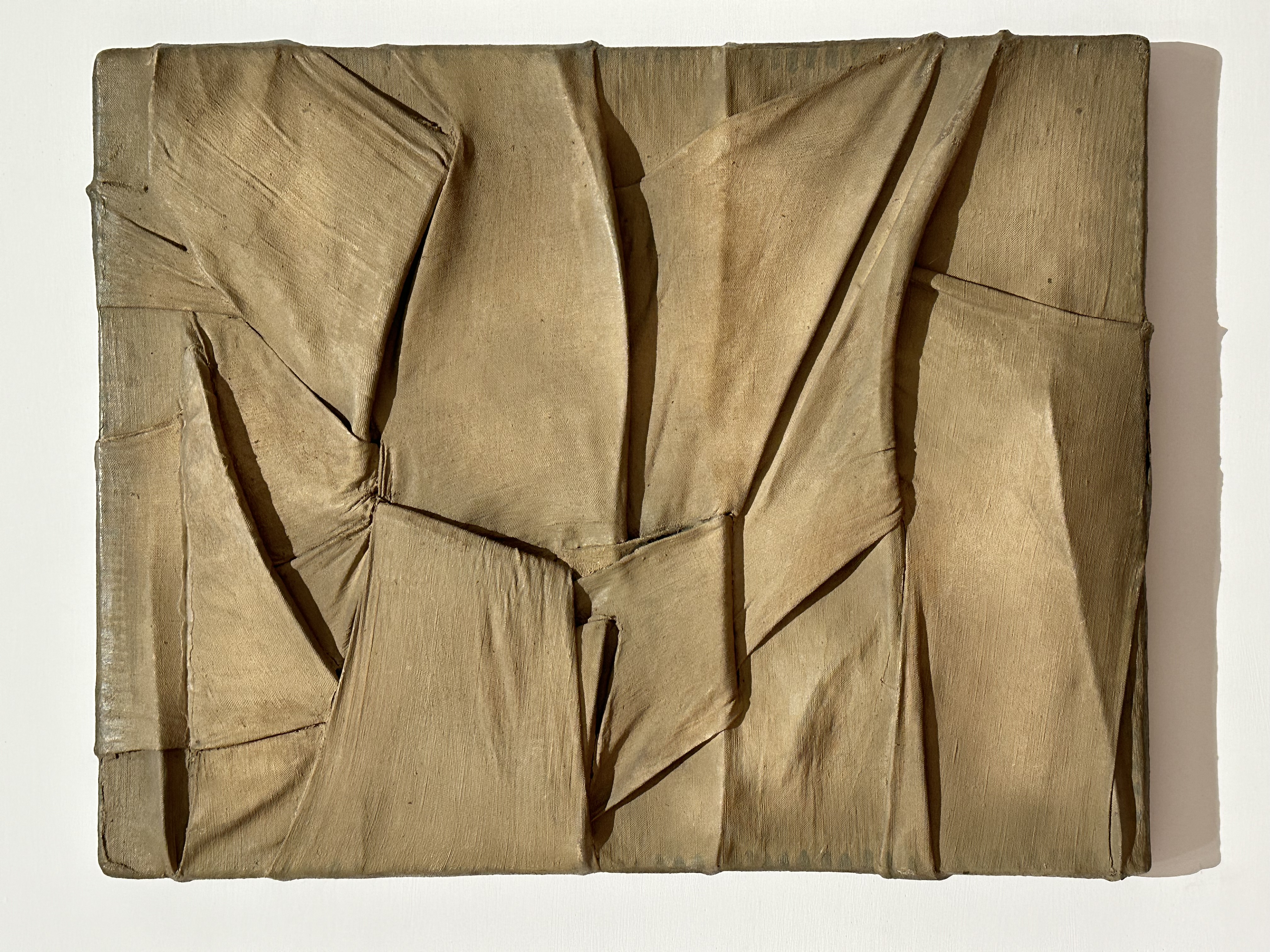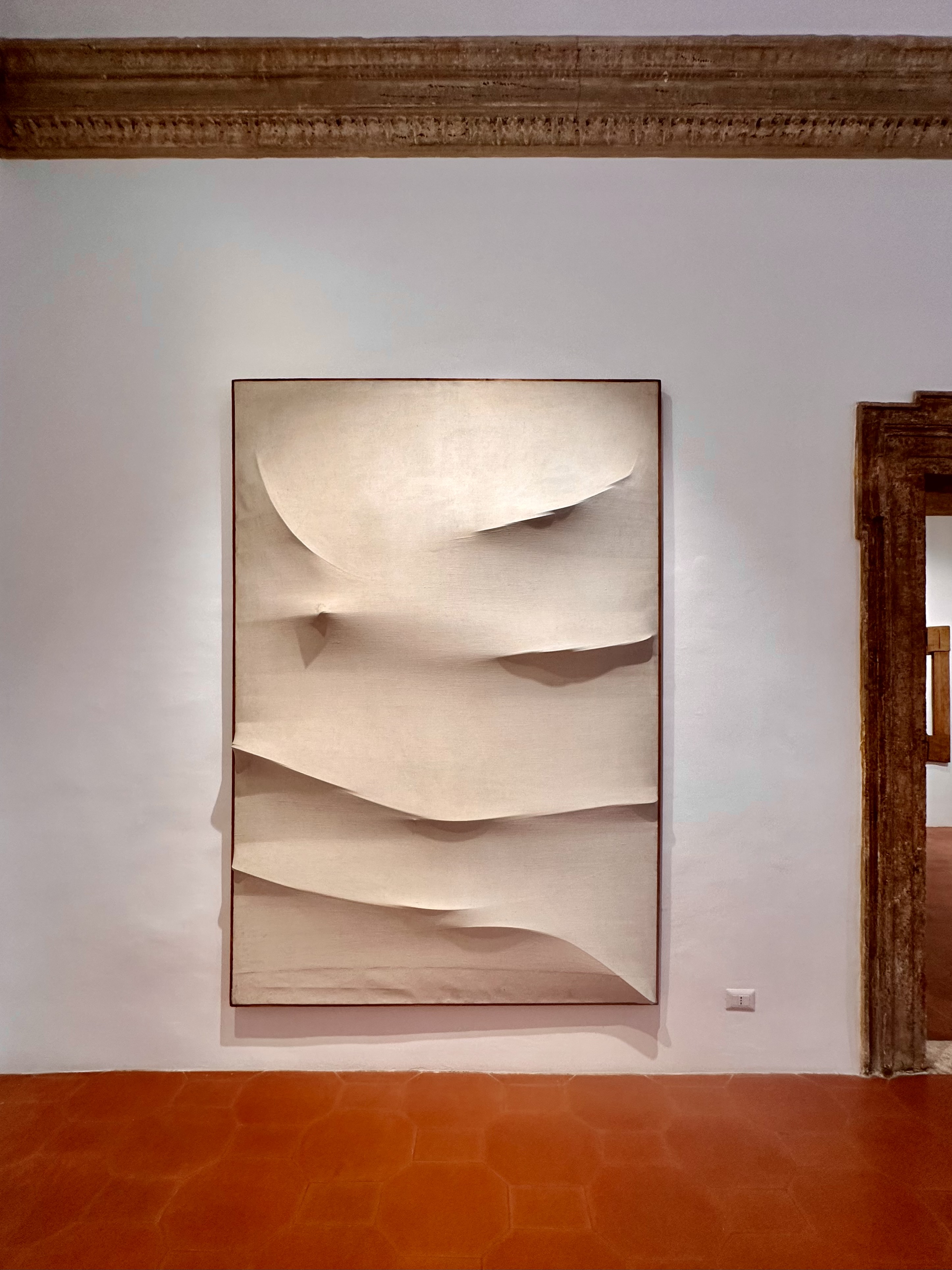 Dall’aggiunta di strutture metalliche costruite con cerchioni di bicicletta celati sotto la tela si generano invece i primi quadri estroflessi. Sono gli anni nei quali Agostino Bonalumi opera nella medesima direzione della sinuosità e della curvatura della tela.