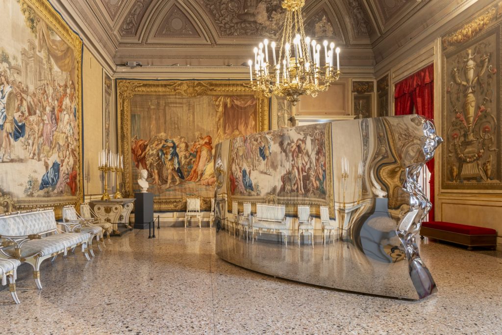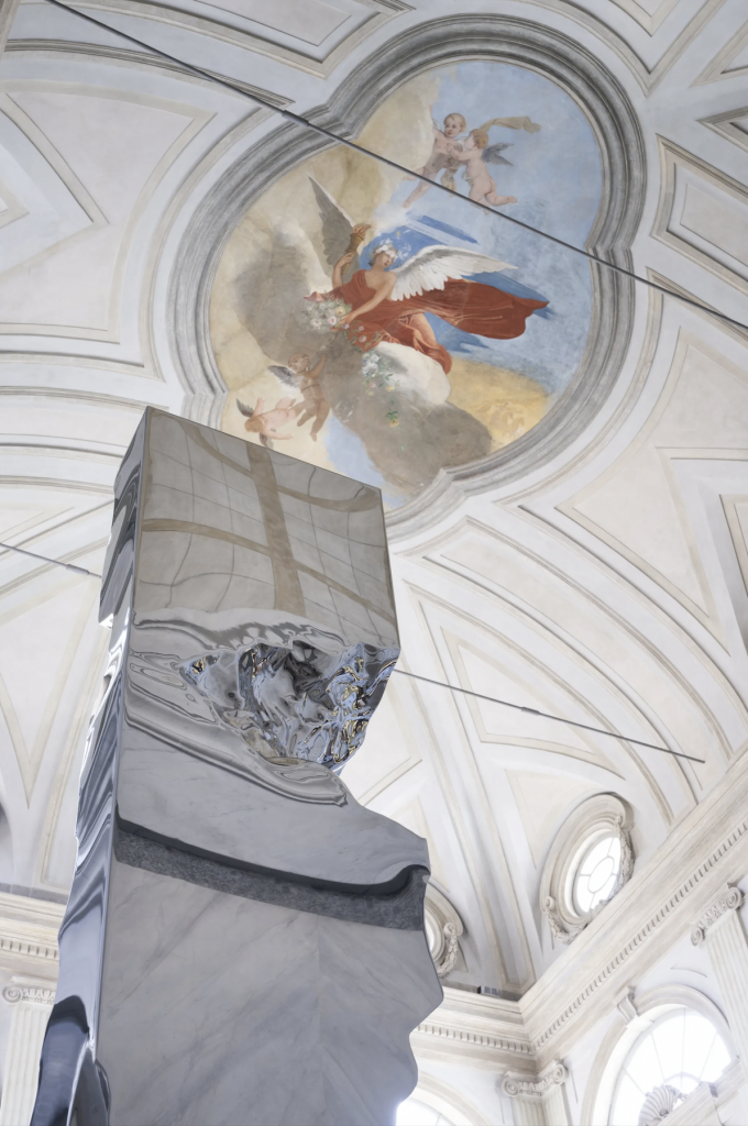 Helidon Xhixha, sensibile conoscitore della tradizione scultorea italiana, non scolpisce l’acciaio ma usa l’acciaio per scolpire la luce, che assorbe e riverbera nelle sue distintive stropicciature. Dentro a quel luogo che lui ha raccontato come «un sogno fin da quando lo vedevo da ragazzo» non racconta solo la storia, simmetrica e speculare di chi alla scuola del riflesso, diviene conoscitore di se stesso, ma modella nel tempo presente e in continuo divenire – con l’amorevolezza che appartiene a un atto di preghiera – l’eterna figura dell’uomo che si guarda, sintesi della ricorrente ambizione di un sapere assoluto e totalizzante, fuso senza riserve con la realtà che lo circonda.