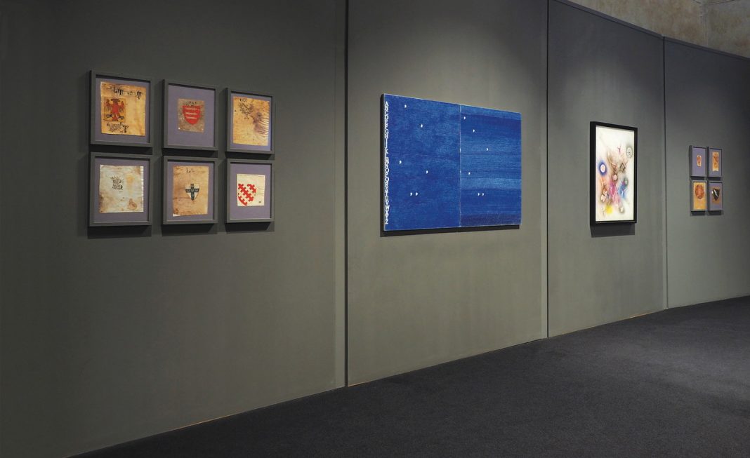 La mostra si articola in un dispositivo a doppia elica: da un lato il repertorio medievale delle pergamene, dall’altro oltre 40 opere di 18 artisti italiani e internazionali — tra cui Alighiero Boetti, Emilio Isgrò, Maria Lai, David Tremlett, Gianni Dessì, Mimmo Paladino, Luigi Ontani — chiamati a confrontarsi con i temi iconografici, araldici, simbolici e materiali di questi documenti antichi. Non si tratta di illustrare o spiegare ma di instaurare relazioni visive, formali, tipologiche o anche solo evocative, come fossero “rebus” temporali. È la mostra stessa, nella sua architettura, a proporre questo dialogo fra passato e presente attraverso cinque sezioni tematiche: Figurazioni, Astrazioni, Motivi, (Ri)scritture e Simboli.