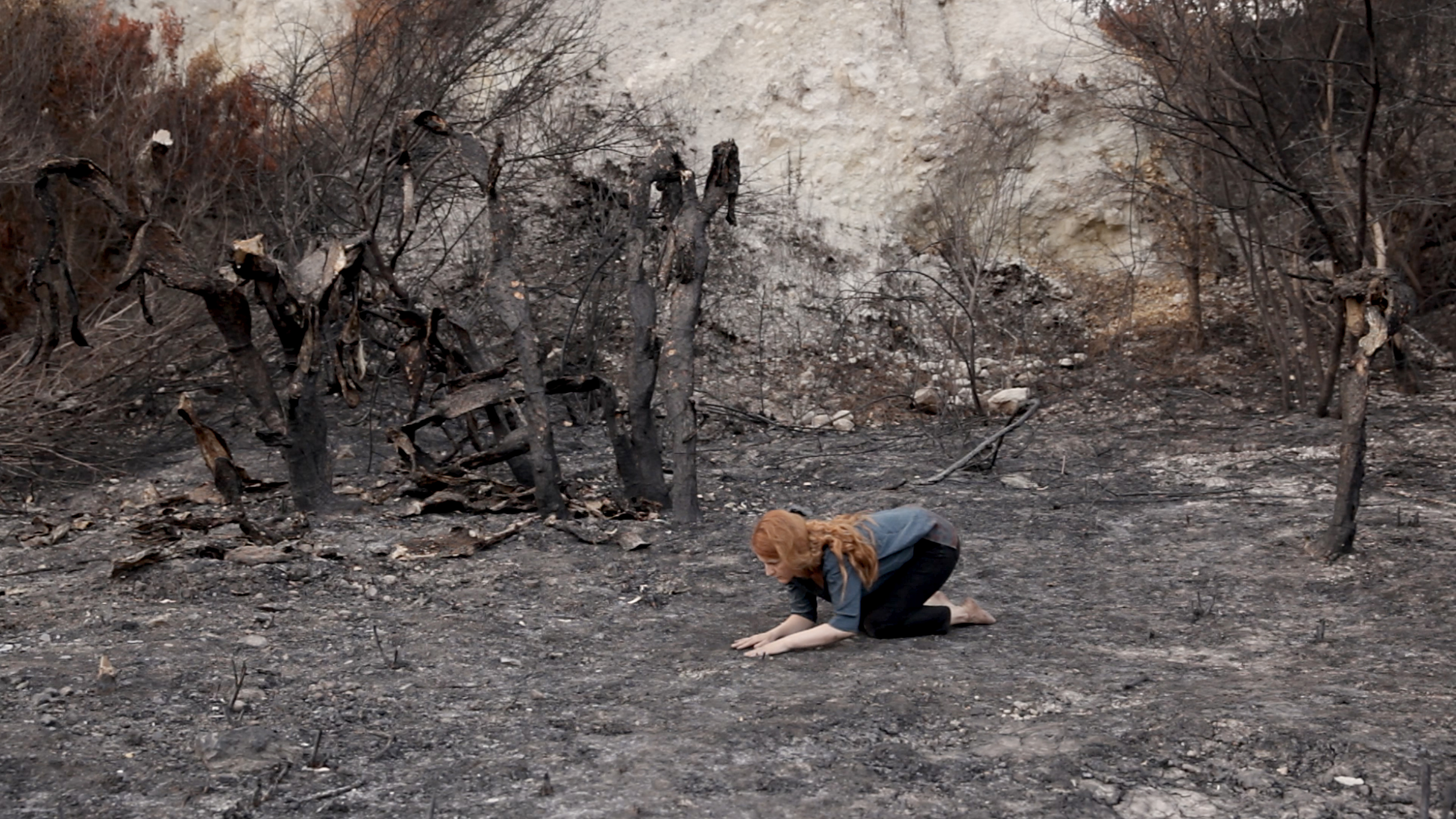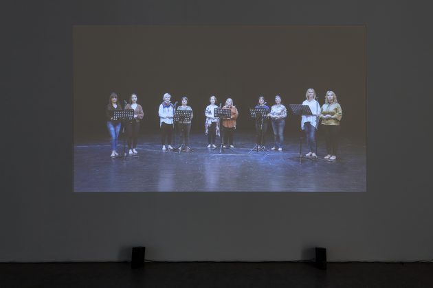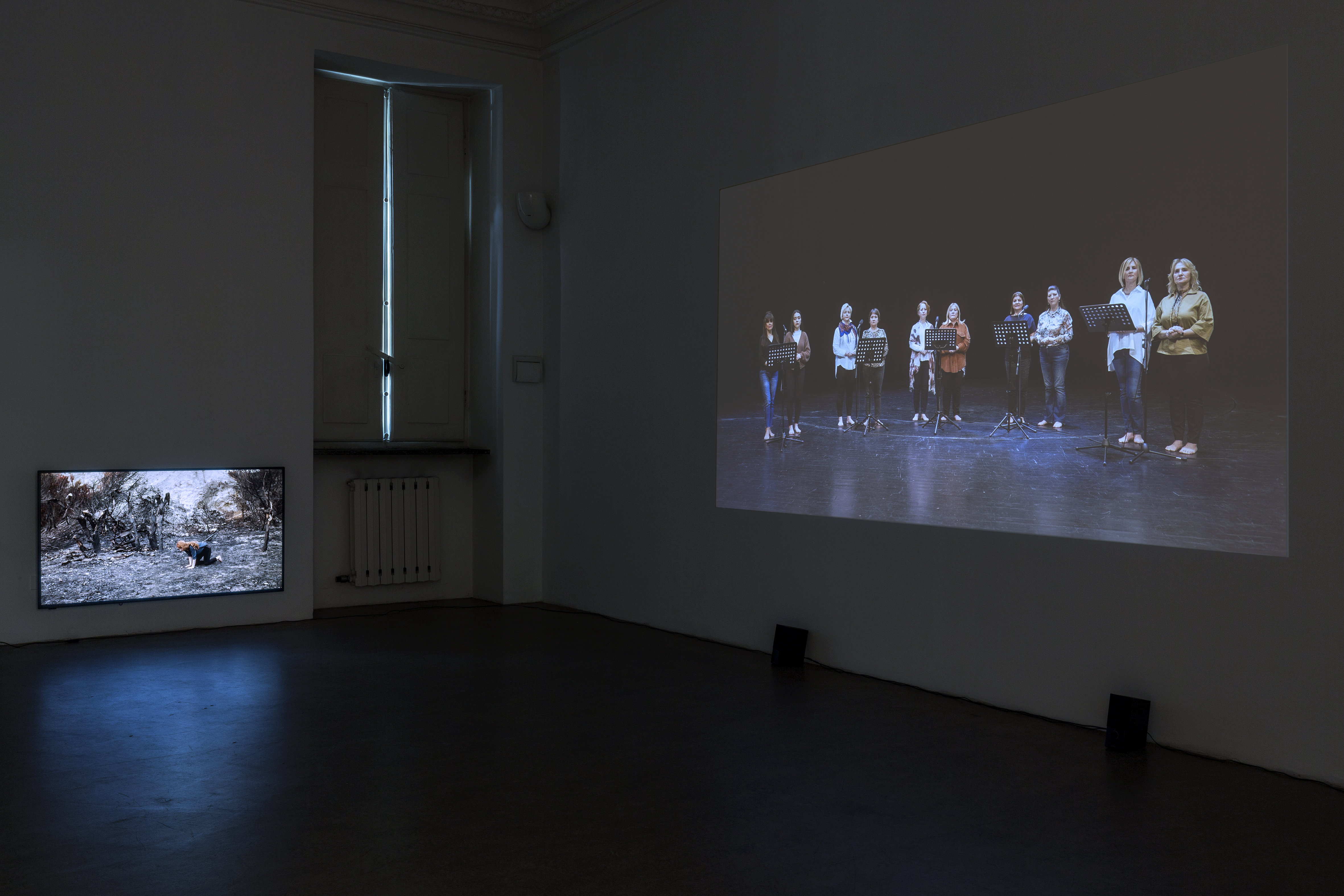 Ma la parte più intensa è interessante della mostra è rappresentata dai due video che sono esposti nell’ultima sala della galleria. Il titolo dei due lavori, tra loro dialetticamente in dialogo, è They burned it all evocando gli incendi che distruggono il paesaggio sulle rive del Mediterraneo, ma anche più in generale la guerra, interiore o esteriore che sia. Un video proiettato su uno schermo più piccolo mostra la stessa artista nell’atto di camminare carponi, come alla ricerca di suoni o tracce di altro tipo sul terreno, in un contesto naturalistico desolato, che fu arso dal fuoco. Un video di più grandi dimensioni è invece ambientato nel teatro di Istanbul e mostra cinque coppie di cantanti che paiono accingersi a intonare un canto, senza tuttavia emettere alcun suono. Questo genera un senso di attesa non colmata, una alienazione e tensione che spinge a riflettere. Solo un mormorio è appena udibile, e ripete ossessivamente in lingua curda appunto le parole “hanno bruciato tutto”.