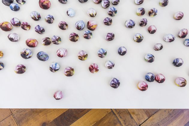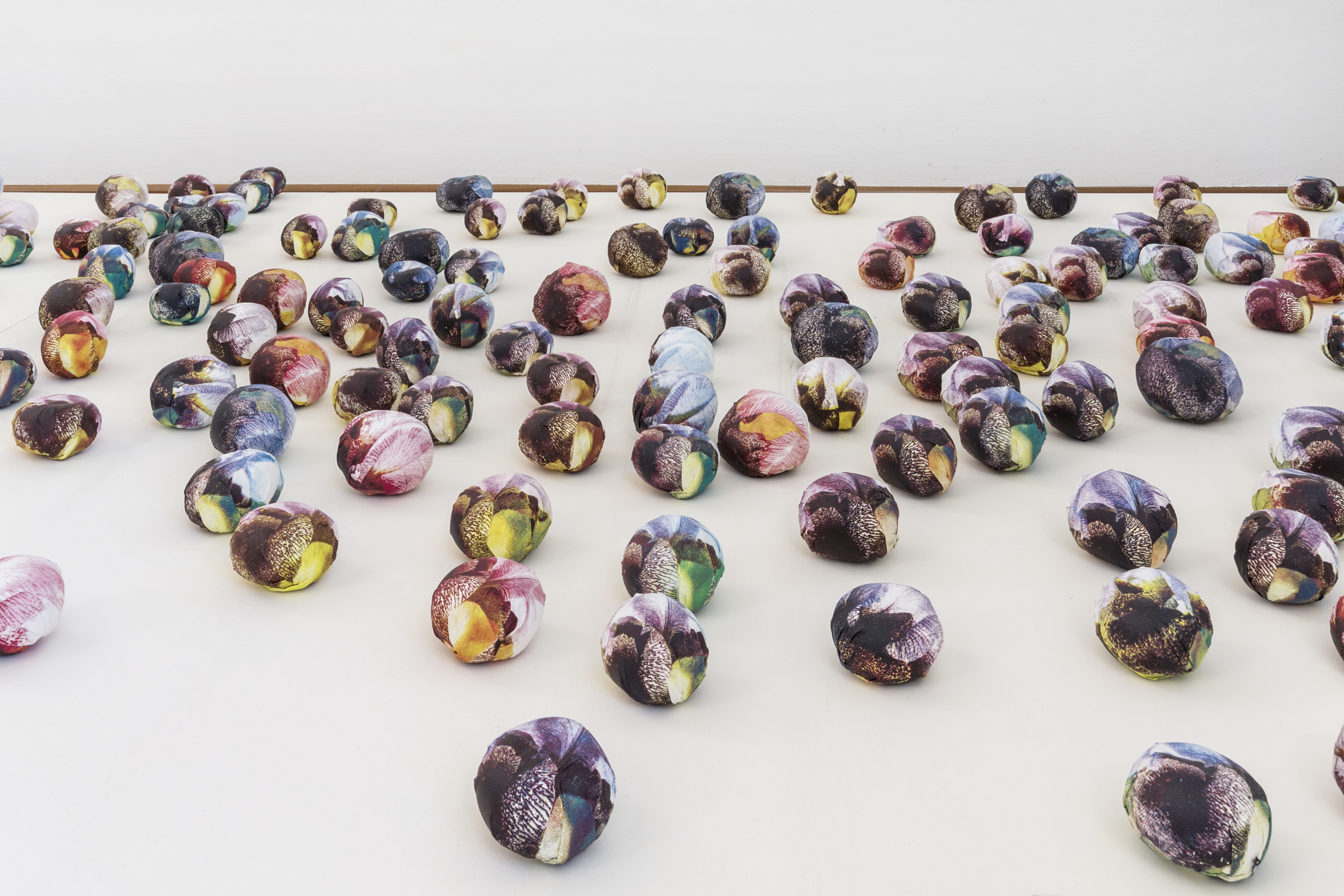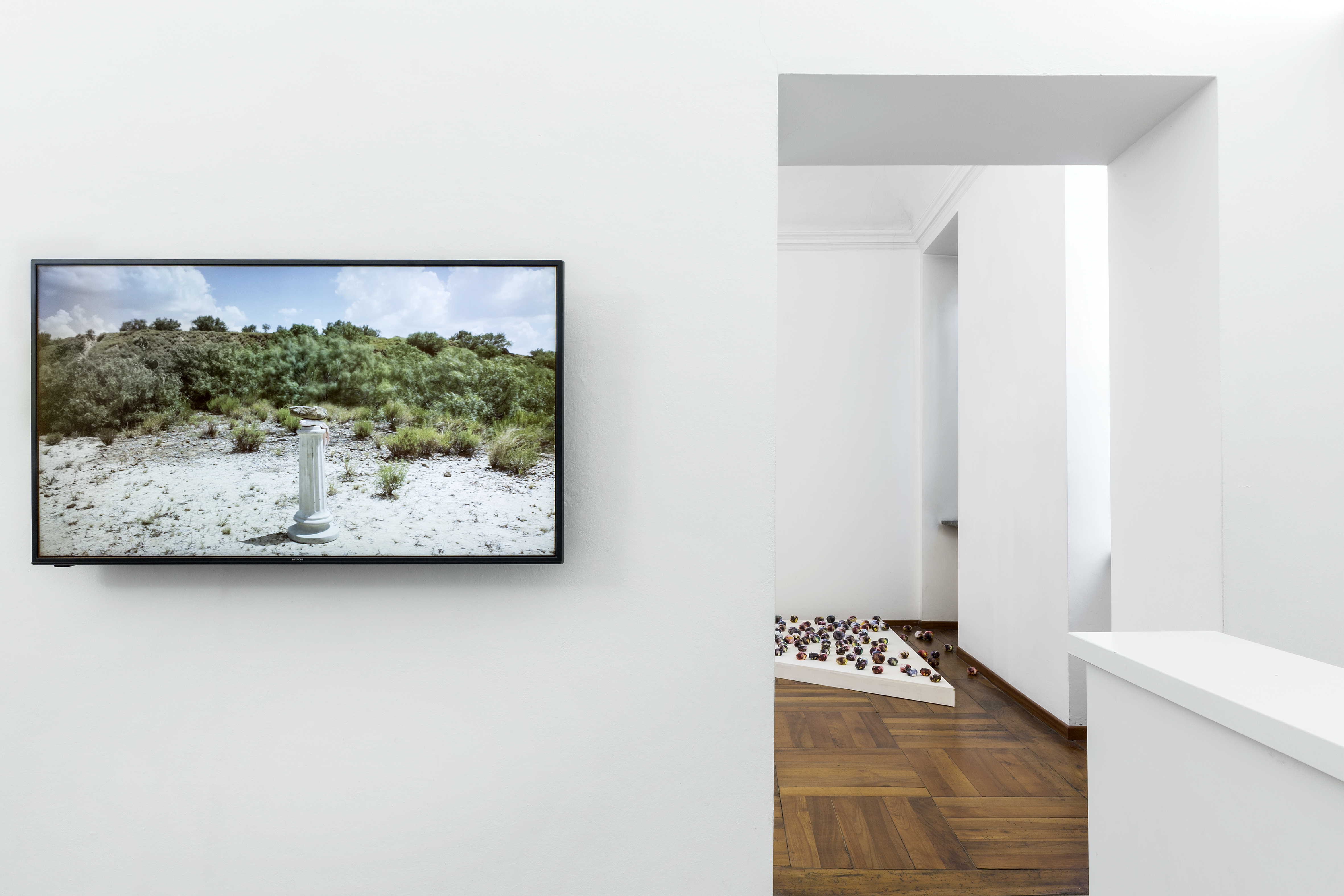 A inizio mostra, poi, il video Man is dead mostra un’immagine che a prima vista appare fissa, se non fosse per qualche refolo di vento che scuote irregolarmente le fronde delle piante di un paesaggio arido e spento, dove troneggia una sorta di monumento funebre composto da una colonna, con sopra un pesce e una pietra. Anche qui la visione d’insieme ha una portata simbolica molto forte. Un’altra installazione si compone di piccoli oggetti simili a pietre o frutta, realizzate con stoffe pressate e colorate. Il riferimento è ancora una volta insieme alla guerra e ai temi ecologici che riguardano i mutamenti climatici.