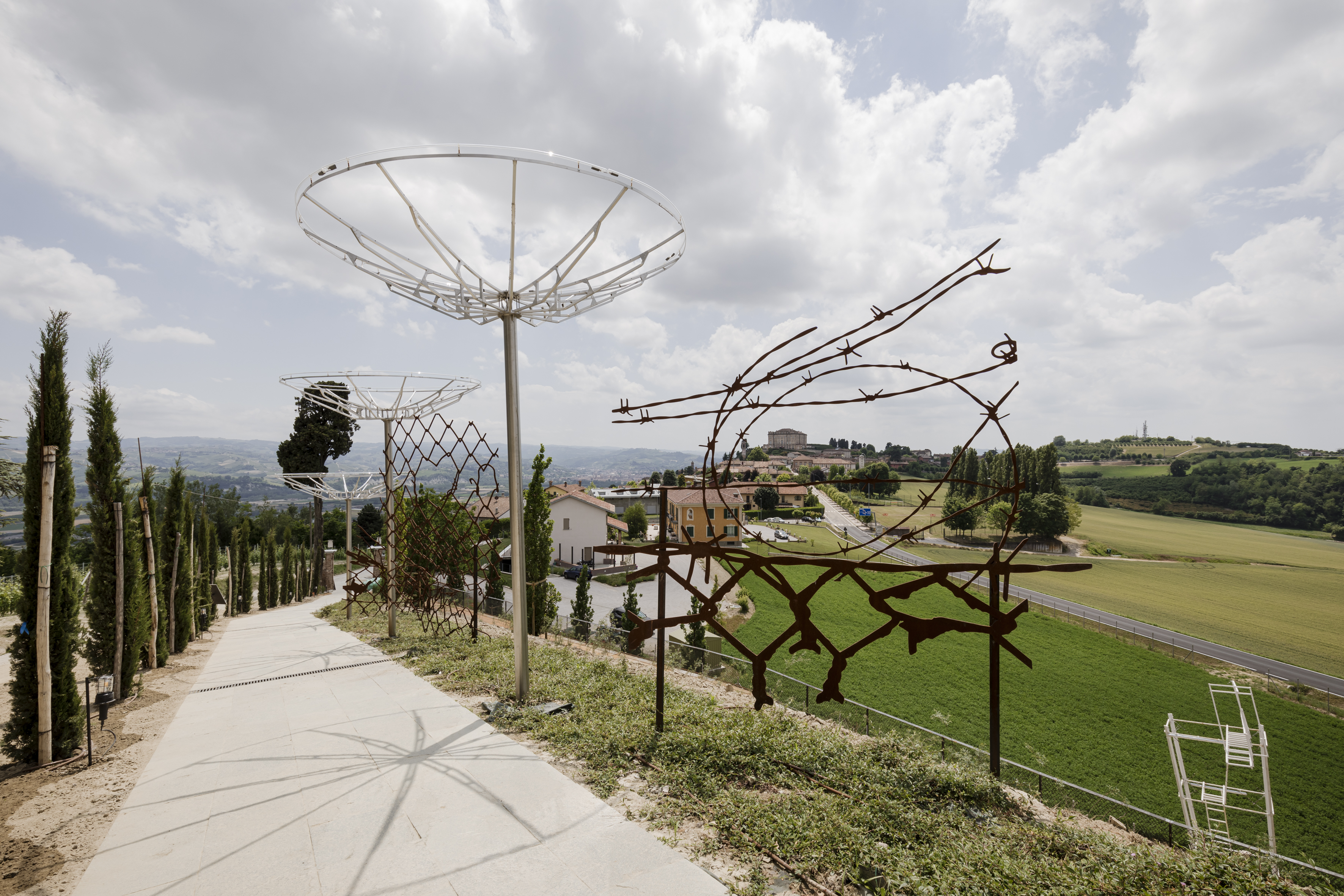 Il parco d’arte è stato progettato dagli architetti paesaggisti Lorenzo Rebediani e Vera Scaccabarozzi ed è ispirato al mosaico di tessere dei campi, dei noccioleti e dei vigneti che lo circondano. Qui le opere di artisti contemporanei provenienti da tutto il mondo sono installate accanto ai filari di una vigna di Nebbiolo, tra i salici, i cipressi e le querce. L’ultima entrata a farne parte è un fiore, una scultura che affonda nella preistoria ma la spedisce nel futuro. Sono questi i periodi temporali scelti da Marguerite Humeau, perché alcune sue opere presentano le fattezze di antichi animali preistorici, ma sono create con l’alta tecnologia della stampa 3D lo sarà sempre di più. Francese, 35 anni un curriculum che la inserisce tra le artiste più considerate oggi non solo dal mercato: viaggia dal Palais de Tokyo (prima grande mostra nel 2016) alla Fondazione Sandretto, appunto. Affascinata da entrambi i mondi passeggia con destrezza nella storia e nella ricerca scientifica come compagne di viaggio per la creazione: come è accaduto con questo fiore che è Ermafrodita, ed è il legame tra la terra della vite e il cielo. Marguerite Humeau ha sviluppato un progetto che nasce da una ricerca che ha coinvolto varie comunità ed esperti locali: produttori di vino, studiosi delle tradizioni alchemiche locali, guaritrici (qui note come masche), geologi, specialisti in energie rinnovabili e biotecnologie, botanici, biologi, specialisti del suolo. Le suggestioni così raccolte hanno contribuito alla concezione di Rise, un’opera è composta da diversi elementi che “esplodono” dal centro. Ogni modulo si ispira agli organi di riproduzione della vite (microscopici nella realtà), dalla nascita delle gemme, alla loro fioritura, allo scambio di polline e alla fecondazione. In particolare, Rise rievoca l’originaria impollinazione incrociata tra un maschio e una femmina di vite: il momento in cui il loro incontro produce il primo fiore ermafrodita, caratteristica diffusa nelle piante di vite coltivata, che possiedono sia fiori femmine che fiori maschi. Il Parco è un museo all’aperto, guidato dal principio della piena accessibilità per tutte e tutti, dove si possono incontrare opere di Ludovica Carbotta, Carsten Holler, Paul Kneale, Manuele Cerutti, Mark Handforth, Wilhem Mundt.