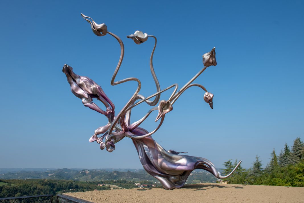 Il parco d’arte è stato progettato dagli architetti paesaggisti Lorenzo Rebediani e Vera Scaccabarozzi ed è ispirato al mosaico di tessere dei campi, dei noccioleti e dei vigneti che lo circondano. Qui le opere di artisti contemporanei provenienti da tutto il mondo sono installate accanto ai filari di una vigna di Nebbiolo, tra i salici, i cipressi e le querce. L’ultima entrata a farne parte è un fiore, una scultura che affonda nella preistoria ma la spedisce nel futuro. Sono questi i periodi temporali scelti da Marguerite Humeau, perché alcune sue opere presentano le fattezze di antichi animali preistorici, ma sono create con l’alta tecnologia della stampa 3D lo sarà sempre di più. Francese, 35 anni un curriculum che la inserisce tra le artiste più considerate oggi non solo dal mercato: viaggia dal Palais de Tokyo (prima grande mostra nel 2016) alla Fondazione Sandretto, appunto. Affascinata da entrambi i mondi passeggia con destrezza nella storia e nella ricerca scientifica come compagne di viaggio per la creazione: come è accaduto con questo fiore che è Ermafrodita, ed è il legame tra la terra della vite e il cielo. Marguerite Humeau ha sviluppato un progetto che nasce da una ricerca che ha coinvolto varie comunità ed esperti locali: produttori di vino, studiosi delle tradizioni alchemiche locali, guaritrici (qui note come masche), geologi, specialisti in energie rinnovabili e biotecnologie, botanici, biologi, specialisti del suolo. Le suggestioni così raccolte hanno contribuito alla concezione di Rise, un’opera è composta da diversi elementi che “esplodono” dal centro. Ogni modulo si ispira agli organi di riproduzione della vite (microscopici nella realtà), dalla nascita delle gemme, alla loro fioritura, allo scambio di polline e alla fecondazione. In particolare, Rise rievoca l’originaria impollinazione incrociata tra un maschio e una femmina di vite: il momento in cui il loro incontro produce il primo fiore ermafrodita, caratteristica diffusa nelle piante di vite coltivata, che possiedono sia fiori femmine che fiori maschi.  Il Parco è un museo all’aperto, guidato dal principio della piena accessibilità per tutte e tutti, dove si possono incontrare opere di Ludovica Carbotta, Carsten Holler, Paul Kneale, Manuele Cerutti, Mark Handforth, Wilhem Mundt.