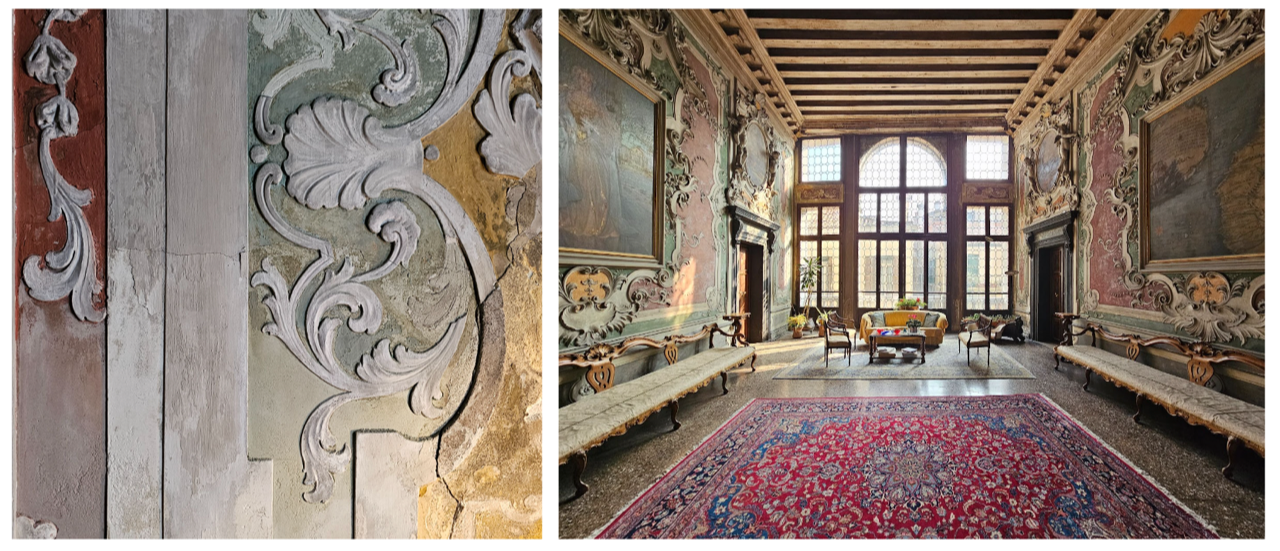 Nel corso del Seicento, poi, il Palazzo cambiò proprietà molte volte, finché non venne acquistato dalla famiglia Baglioni, specializzata nella realizzazione di libri religiosi, che arricchì stanze e saloni con stucchi, affreschi e mobilio ancora oggi presenti in situ. La storia variegata e intrigante del Palazzo, che fa da cornice alle opere di Auerbach, è raccolta in un libro scritto dall’architetto Francesco da Mosto.