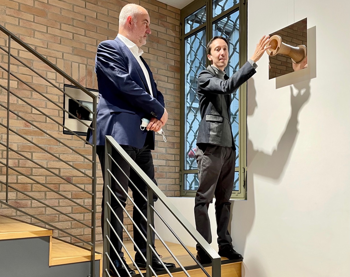 Non è soltanto un’invocazione, alla musa ispiratrice, per fare tesoro di un passato – autobiografico quanto collettivo – e da quel passato ricostruire un futuro nuovo, ma è anche l’opera che apre “Pars Construens”, la mostra che presenta per la prima volta alcune opere tratte dall’articolato progetto artistico-culturale “Blind Wood” di Fulvio Morella. Come un megafono che, da un momento all’altro narrerà infinite storie, il lavoro ha in sé tutti i segni distintivi dell’esposizione curata da Sabino Maria Frassà: ovvero l’arte della tornitura ai metalli e il ripensamento del sistema di scrittura braille in funzione artistica ed estetica a duecento anni dall’intuizione di Louis Braille.