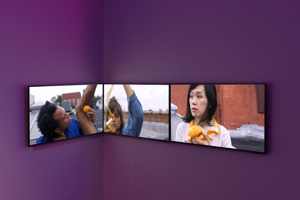 Il pomodoro ha una lunga relazione con l’ambiguo. La sua etimologia romanza scricchiola ancora del fraintendimento con la mela (il “pomme d’or”) e oggi nessun accordo è possibile tra chi lo considera frutto o ortaggio. In una giornata del 1820, un certo Robert Gibbon Johnson, colonnello e orticultore, salì sui gradini di un tribunale del New Jersey per mangiarlo pubblicamente. La sua incolumità sarebbe stata prova di commestibilità: alle soglie della modernità le fasce più basse della popolazione degli Stati Uniti non erano del tutto convinte che non fosse velenoso… È una strana coincidenza quella tra questo signore e la Johnson: non solo lo stesso cognome, ma lo stesso soggetto esattamente duecento anni dopo. Ribadisce, in un certo senso, che tutto è unito, come avviene nello scambio di arance del secondo video (Oranges, 2023) dove il frutto scorre di palmo in schermo, attaccato alla parete come un serpente; nessuno aveva mai connesso l’arancio al peccato… del resto, la malizia è sempre negli occhi di chi guarda (in questo caso di chi scrive).
