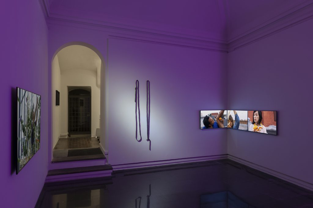 Daisy Chain, titolo del progetto, è un termine che indica più cose: una corona di margherite, dispositivi connessi dall’elettricità e una formazione sessuale di gruppo. L’espressione evoca sempre processi di relazione, collaborazione e interazione tra persone o cose. Alla luce di questo, nel tono viola della galleria, l’occhio si posa sulle sculture in bronzo appese tra i due video: cinte che legano gli erbari, oppure le carni? Non lo sapremo, ma ringraziamo l’artista di continuare, ostinatamente, a tenere aperto il cerchio.